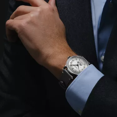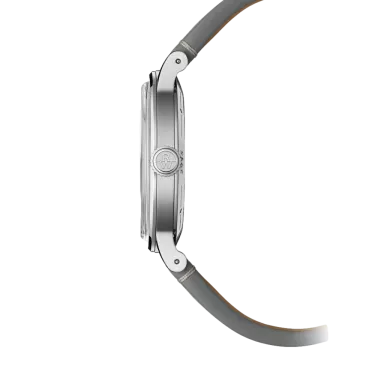 Bei genauerer Betrachtung kommen die verschiedenen Verarbeitungen des Zifferblatts zur Geltung: die Stundenspur ist glatt, die Minutenspur ist azuriert und die Zifferblattmitte ist mit einem zarten, vertikalen Strich verziert. Diese Uhr verfügt über Super-Luminova®-Indizes und ein speziell für die Kollektion entworfenes Fenster auf der 6-Uhr-Position. Dieses zeigt die Mondphasen in zugleich grafischer und klassischer Form an. Das einzigartige Monddesign, angelehnt an traditionelle Uhrmacherkunst mit modernem Touch, präsentiert ein lächelndes Gesicht mit Planeten und Sternen und ermöglicht dem Träger eine klare Ablesung mit positiver Note.