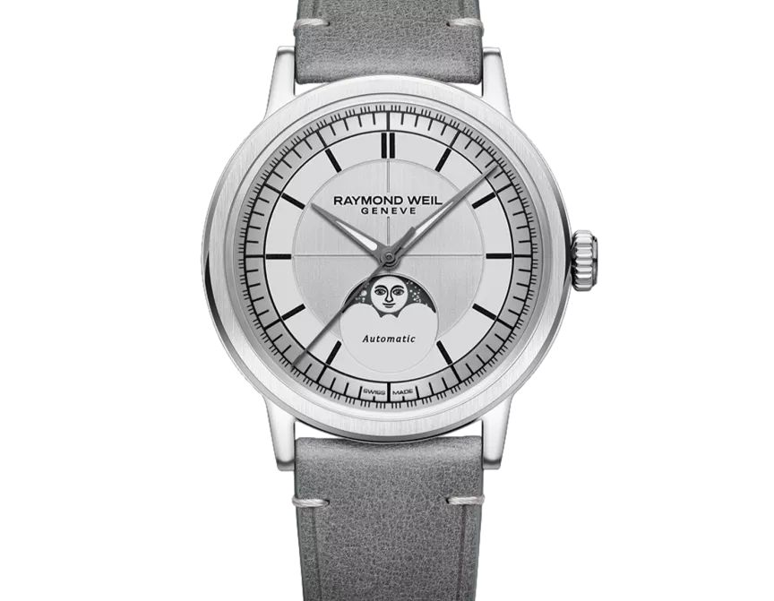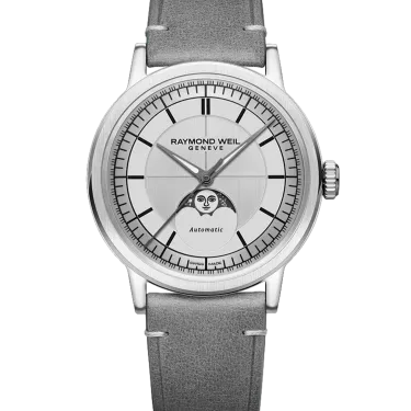 Die millesime mit Mondphasenanzeige haucht dieser klassischen Komplikation neues Leben ein. Das optisch unterteilte, grafisch gestaltete Zifferblatt ermöglicht dem Träger eine dynamische und intuitive Ablesung der Mondphasen. Die Einführung der Mondphasenanzeige, einer emblematischen Uhrenfunktion, läutet eine neue Welle kreativer Eleganz für RAYMOND WEIL ein.