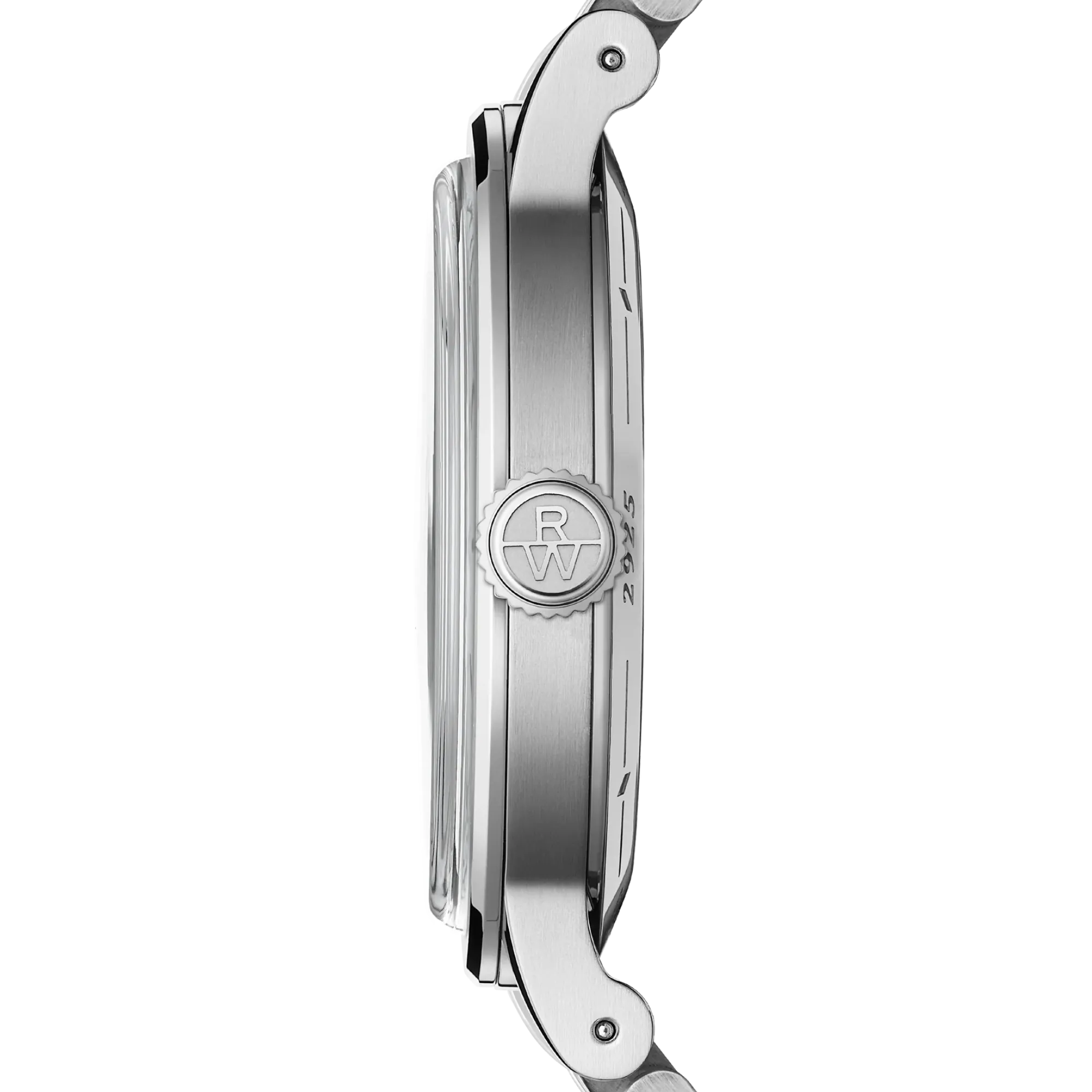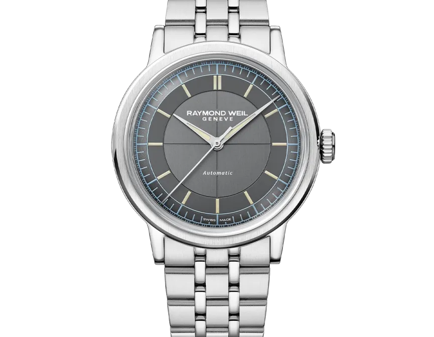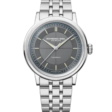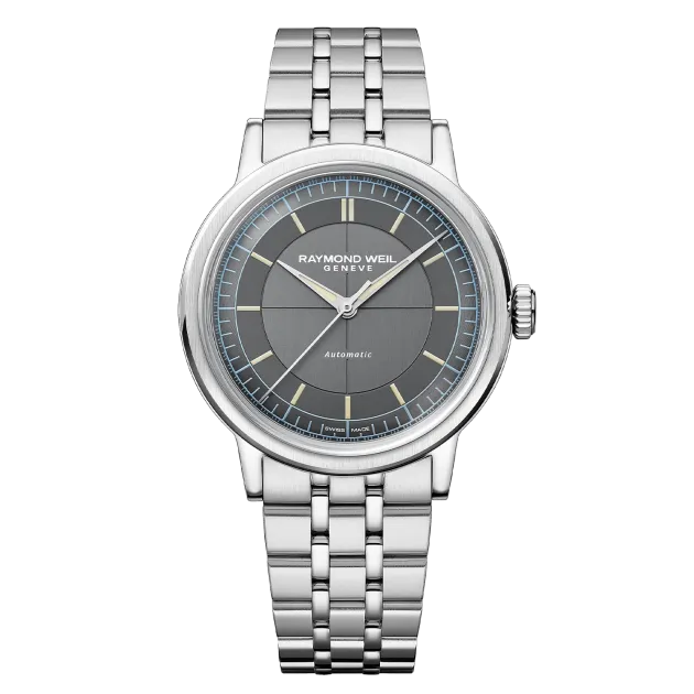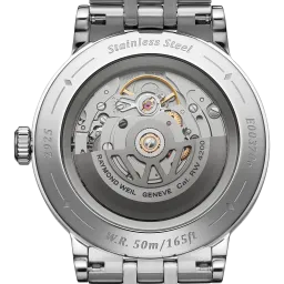 Ein Saphirglasboden gibt den Blick auf das Automatikwerk im Inneren und die „W-förmige” Schwungmasse frei, das Markenzeichen der Uhren von RAYMOND WEIL.