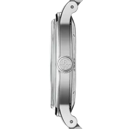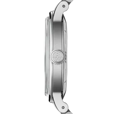 Bei näherer Betrachtung des Zifferblatts fallen die kontrastierenden Oberflächen auf: Die Stundenbahn ist glatt, die hellblaue Minutenbahn ist gewellt und der mittlere Bereich des Zifferblatts ist mit einer zarten vertikalen Bürstung verziert. Die Lünette ist mit einer vertikalen Satinierung verziert, die einen wunderbaren Kontrast zu der hochglanzpolierten Abschrägung bildet. Diese Gegenüberstellung zweier Oberflächen unterstreicht die hochwertige Verarbeitung.