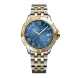 Die klassische zweifarbige Tango-Herrenquarzuhr in Gold und Stahl verfügt über ein rundes Edelstahlgehäuse mit 41 mm Durchmesser, Armbandglieder mit PVD-Beschichtung in Gold, ein elegantes blaues Zifferblatt mit goldbeschichteten römischen Ziffern und ein Datumsfenster auf der Drei-Uhr-Position.