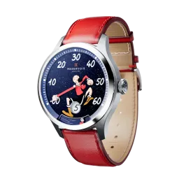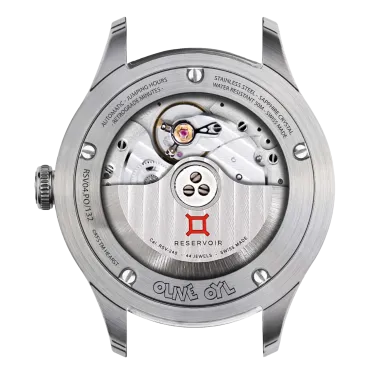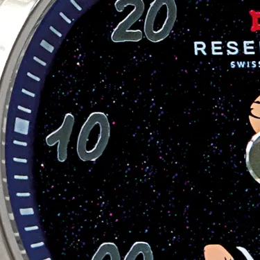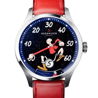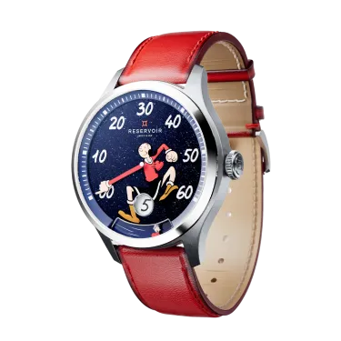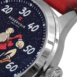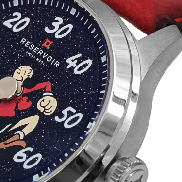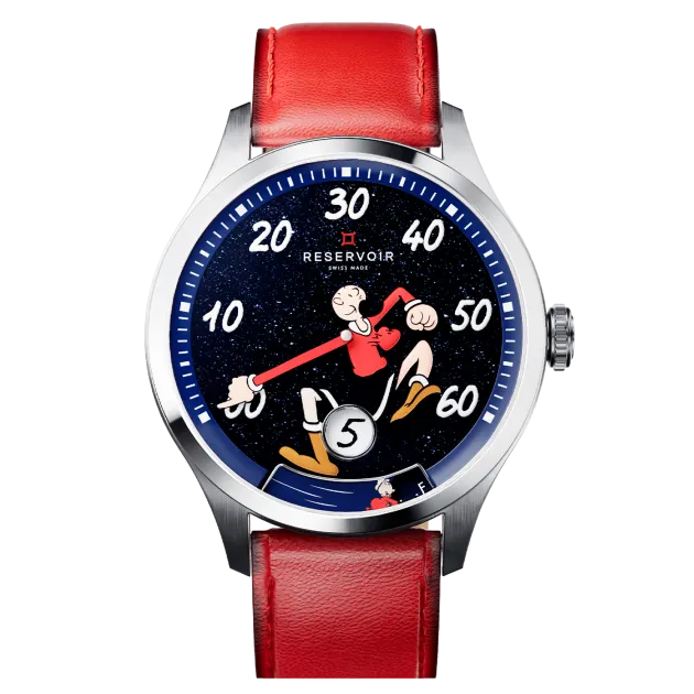 Dieser exquisite Zeitmesser verbindet künstlerische Genialität mit der Präzision der Schweizer Uhrmacherkunst und verfügt über ein faszinierendes blaues Sandstein-Zifferblatt, das an einen sternenklaren Himmel erinnert. Vor diesem himmlischen Hintergrund ist die beliebte Comicfigur Olive Oyl zusammen mit ihrem entzückenden Schützling Swee’Pea abgebildet, was dem raffinierten Design einen Hauch von Verspieltheit und Nostalgie verleiht. Olive Oyl ist mehr als nur eine Comicfigur; sie ist ein Symbol für Ausdauer und Spontaneität und verkörpert das Ethos von RESERVOIR: „Scheitern oder siegen, aber sei mutig.“ Das blaue Sandstein-Zifferblatt zeigt Olive Oyls Arm als Zeiger in einem 39-mm-Edelstahlgehäuse mit satinierter und polierter Oberfläche, der elegant auf die geprägten weißen Ziffern zeigt, die die Minuten markieren, während Swee'Pea spielerisch die Gangreserve anzeigt.