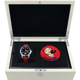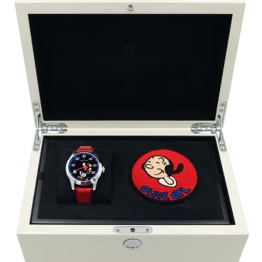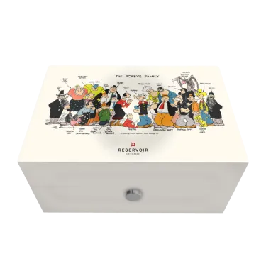 Geliefert in einer weißen Holzbox, verziert mit einem Bild der „Popeye-Familie“ (© 2022 King Features Syndicate ™ Hearst Holdings, Inc.), einer speziellen Stickerei zu Ehren der Comicfigur Olive Oyl.