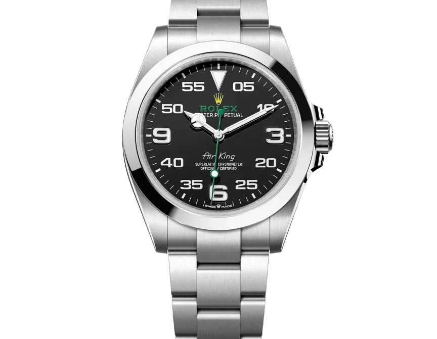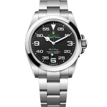 Rolex Air-King 126900 Uhrwerk: Automatik Gehäusegröße: 40 mm Gehäusematerial: Stahl Armbandmaterial: Stahl (Oyster) Zifferblatt: Schwarz, arabische Ziffern Wasserdichtigkeit: 100 Meter