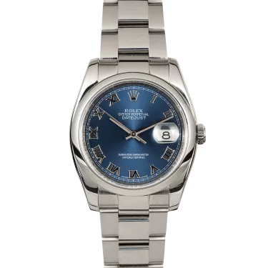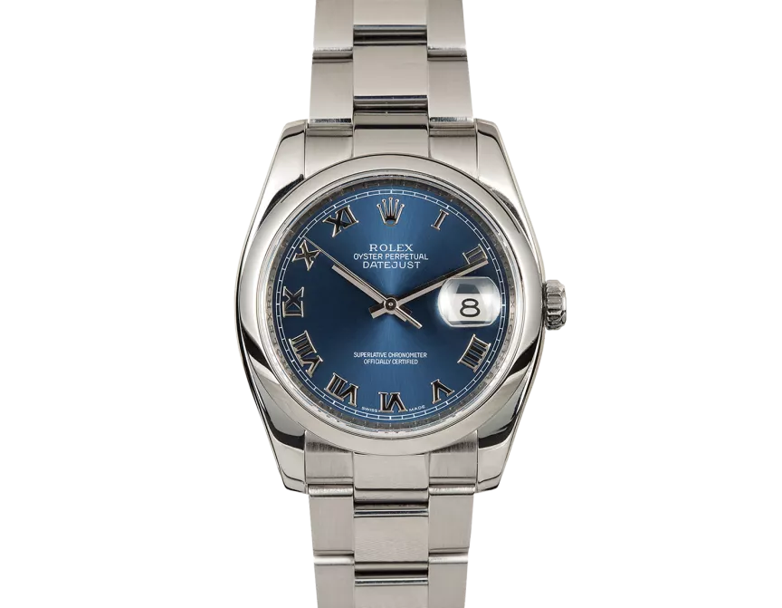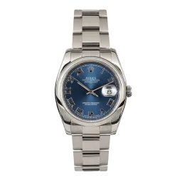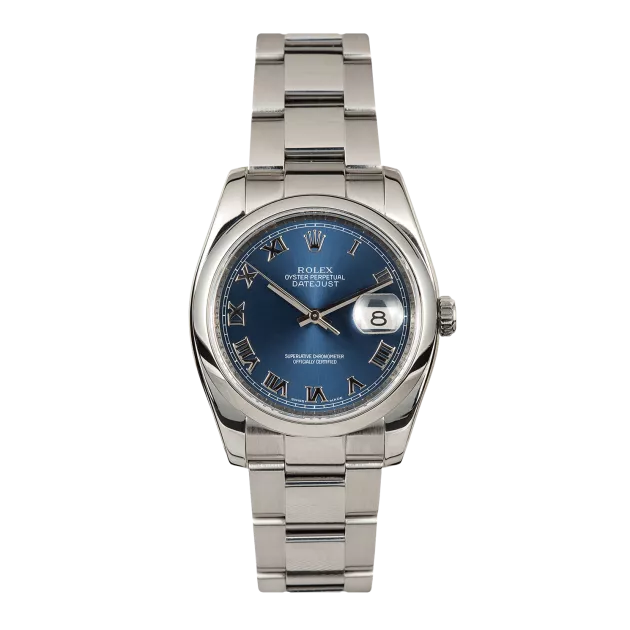 Rolex Datejust 116200 Uhrwerk: Automatik Gehäusegröße: 36 mm Gehäusematerial: Stahl Armbandmaterial: Stahl (Oyster) Zifferblatt: Blau mit römischen Ziffern Wasserdichtigkeit: 100 Meter