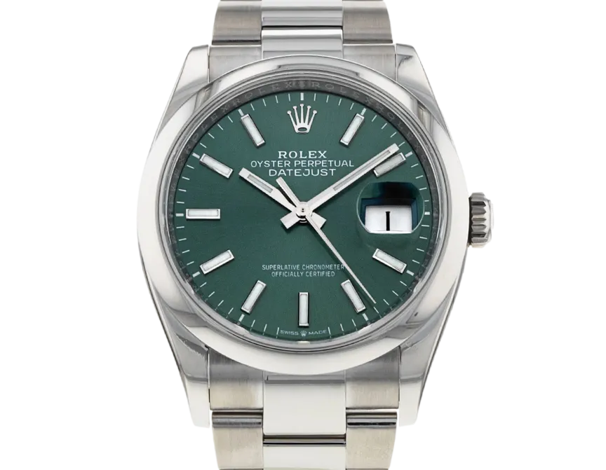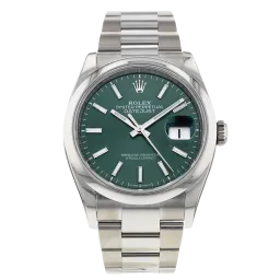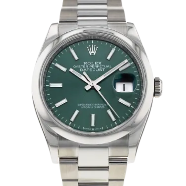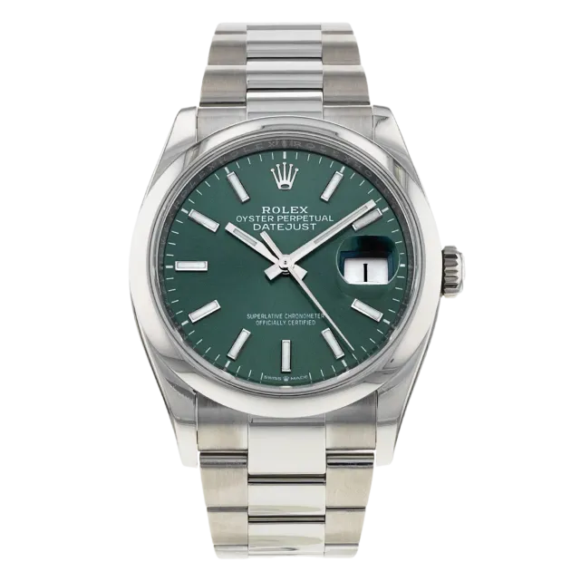 Rolex Datejust 126200 Uhrwerk: Automatik Gehäusegröße: 36 mm Gehäusematerial: Stahl Armbandmaterial: Stahl (Oyster) Zifferblatt: Mintgrün, Baton Wasserdichtigkeit: 100 Meter