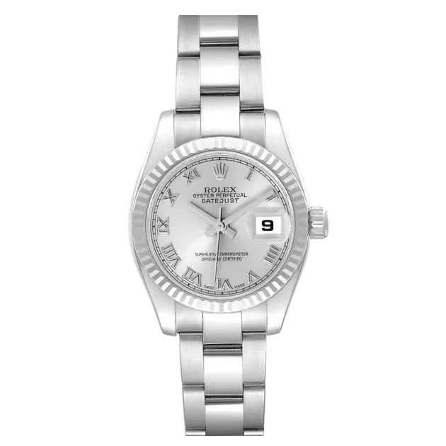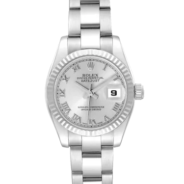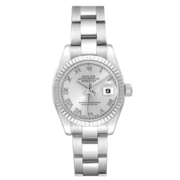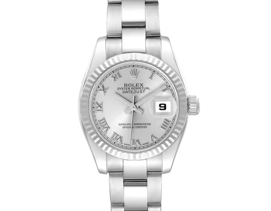 Rolex Datejust Lady 179174 Uhrwerk: Automatik Gehäusegröße: 26 mm Gehäusematerial: Stahl und Weißgold Armbandmaterial: Stahl (Oyster) Zifferblatt: Silber mit römischen Ziffern Wasserdichtigkeit: 100 Meter