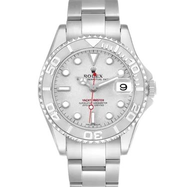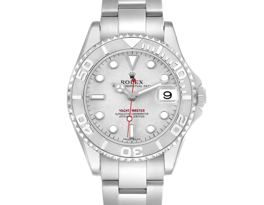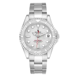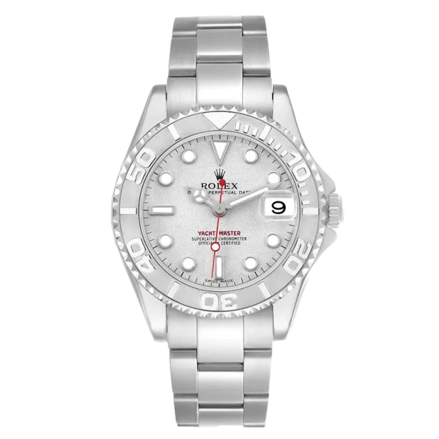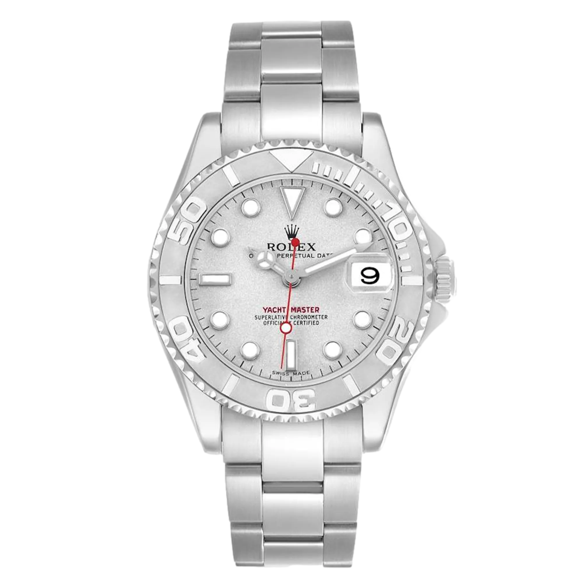 Rolex Yacht-Master 168622, 35 mm, Edelstahlgehäuse und Oyster-Armband, Lünette aus Platin, Faltschließe, silbernes Zifferblatt, Automatikwerk, inklusive Originalverpackung und Originalpapieren; die Uhr befindet sich in einwandfreiem Zustand. Diese Uhr wurde geprüft, zertifiziert und einer Wasserdichtigkeitsprüfung unterzogen; sie verfügt über eine 2-jährige Garantie ab Kaufdatum.