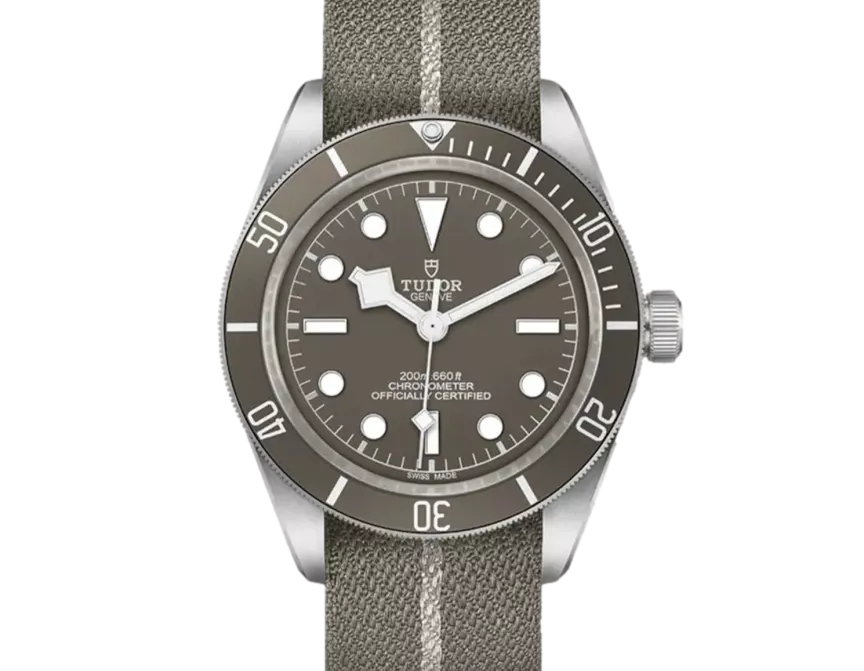 Tudor Black Bay 58 M79010SG-0002 Uhrwerk: Automatik Gehäusegröße: 39 mm Gehäusematerial: Silber Armbandmaterial: Stoff – Taupe Zifferblatt: Taupe Wasserdichtigkeit: 200 Meter