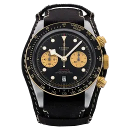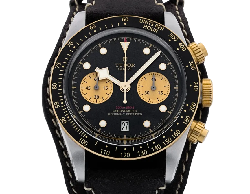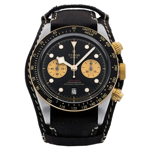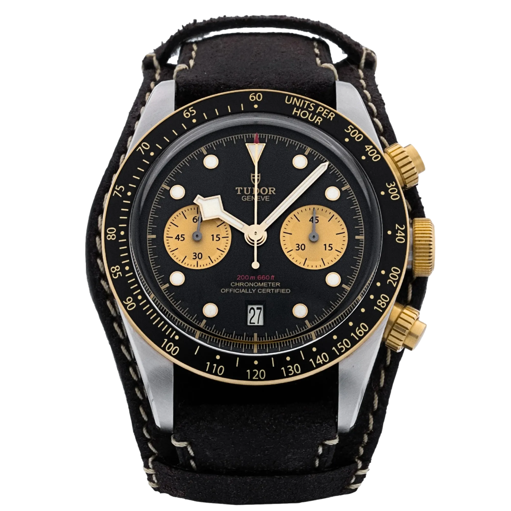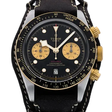Tudor Black Bay Chrono M79363N-0002 Uhrwerk: Automatik Gehäusegröße: 41 mm Gehäusematerial: Stahl und Gelbgold Armbandmaterial: Leder – Braun Zifferblatt: Schwarz Wasserdichtigkeit: 200 Meter