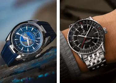 A chronograph is a complication that allows you to measure short intervals independently from the main time display, often via recognizable sub-dials that track elapsed seconds, minutes, or hours. You’ll find this complication in many models in our collection, such as Omega’s Speedmaster and Seamaster, as well as timeless classics like TAG Heuer’s Carrera or Breitling’s Navitimer. Here too, intricacy elevates the watch into a true work of art: at the start of a race, the chronograph must engage smoothly and responsively, without disrupting the time display, and then stop with the same exactness. It’s a bit like fitting a car with two engines that run independently yet never interfere with each other — except here, it all happens on a microscopic scale, strapped to a constantly moving wrist, while still maintaining flawless accuracy. The challenge of miniaturization reaches new heights with split-seconds chronographs, which can measure two separate times simultaneously — for example, two runners starting at the same moment — making this not only a highly useful sporting tool but also a showcase of technological prestige.
