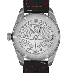 This Startimer Pilot Automatic is presented in a 40 mm case with a black Cordura textile strap featuring red topstitching. The automatic movement offers a 68-hour power reserve. The watch displays hours, minutes, seconds, and the date at 6 o'clock.
