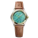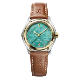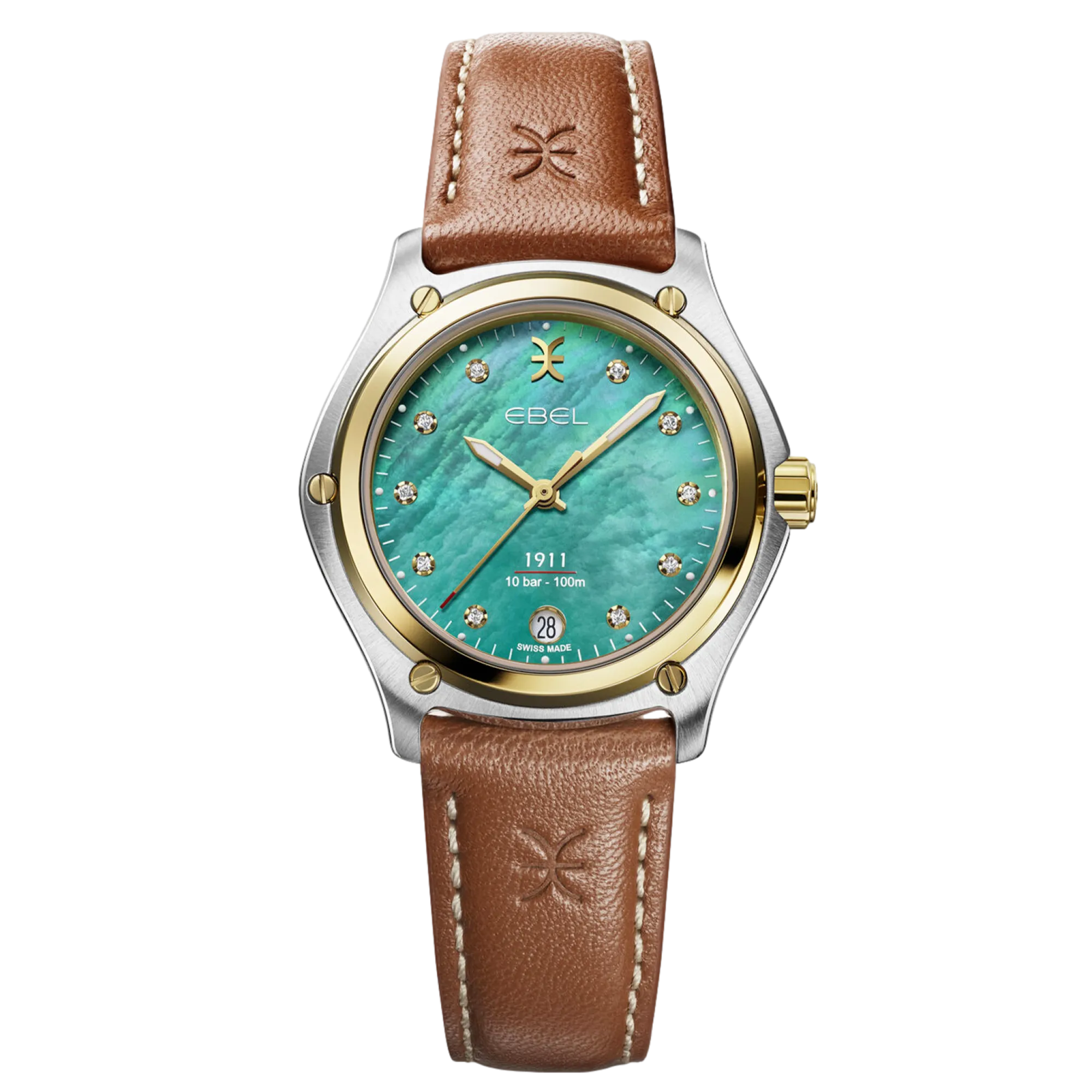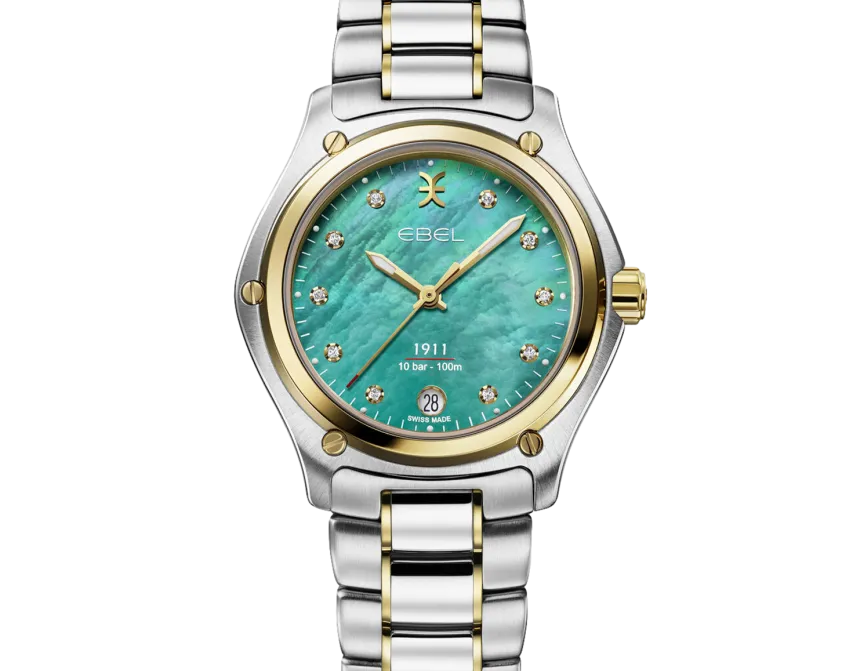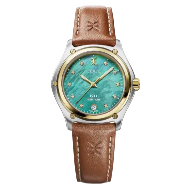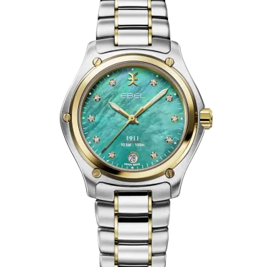 Women's watch EBEL 1911, stainless steel and 18K yellow gold case, Ø 34mm, deep turquoise mother-of-pearl dial with 10 diamonds (0.065ct), date window at 6:00, sapphire crystal with antireflective treatment underneath, two-tone stainless steel links bracelet, folding clasp, comes with additional brown calf strap, Swiss quartz movement, water-resistant up to 10 bar.
