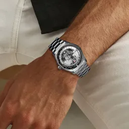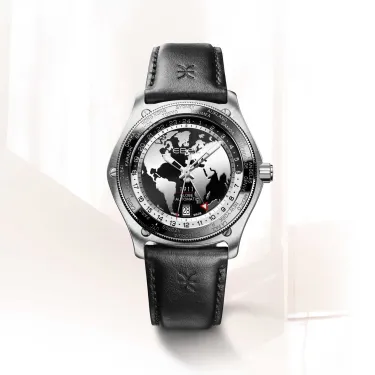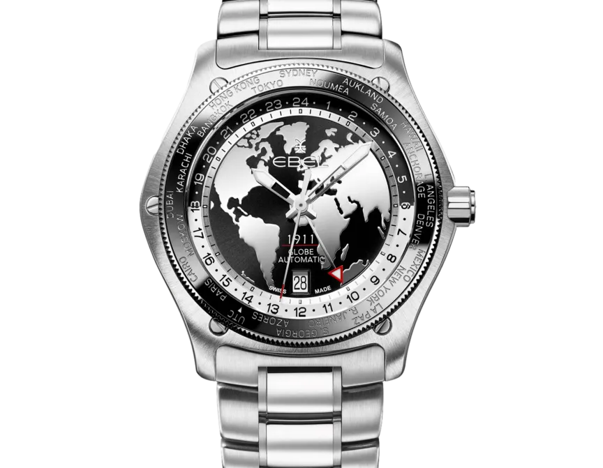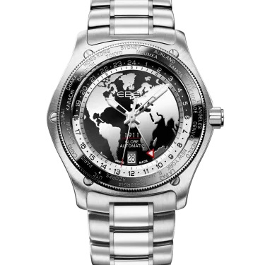 Men's watch EBEL 1911, stainless steel case with black ceramic bezel ring, Ø 42mm, black galvanic dial with rhodium-plated continents, date window at 6:00, Worldtimer fonction with exact time in 24 locations representing the 24 reference time zones on the ceramic bezel, sapphire crystal with antireflective treatment underneath, saphhire crystal case-back, stainless steel links bracelet, folding clasp, comes with additional black calf strap, Swiss automatic movement, water-resistant up to 10 bar.