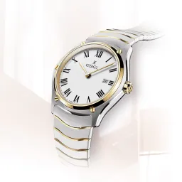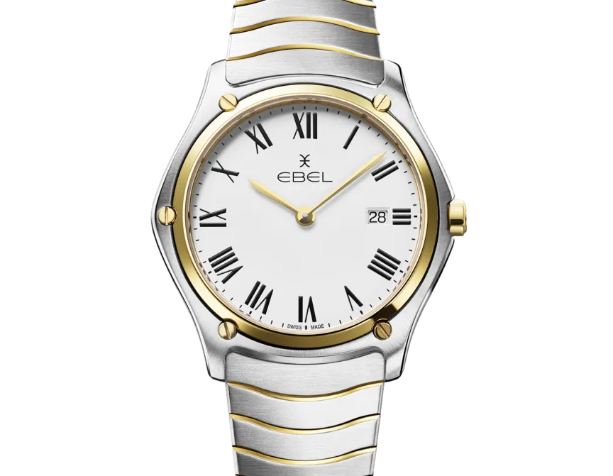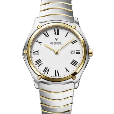 EBEL Sport Classic watch, stainless steel case with 18K yellow gold bezel, screws and crown, Ø 37mm, white dial with Roman numerals painted in black, sapphire crystal with antireflective treatment underneath, two-tone stainless steel wave link bracelet with a folding clasp, Swiss quartz movement, water-resistant up to 5 bar.