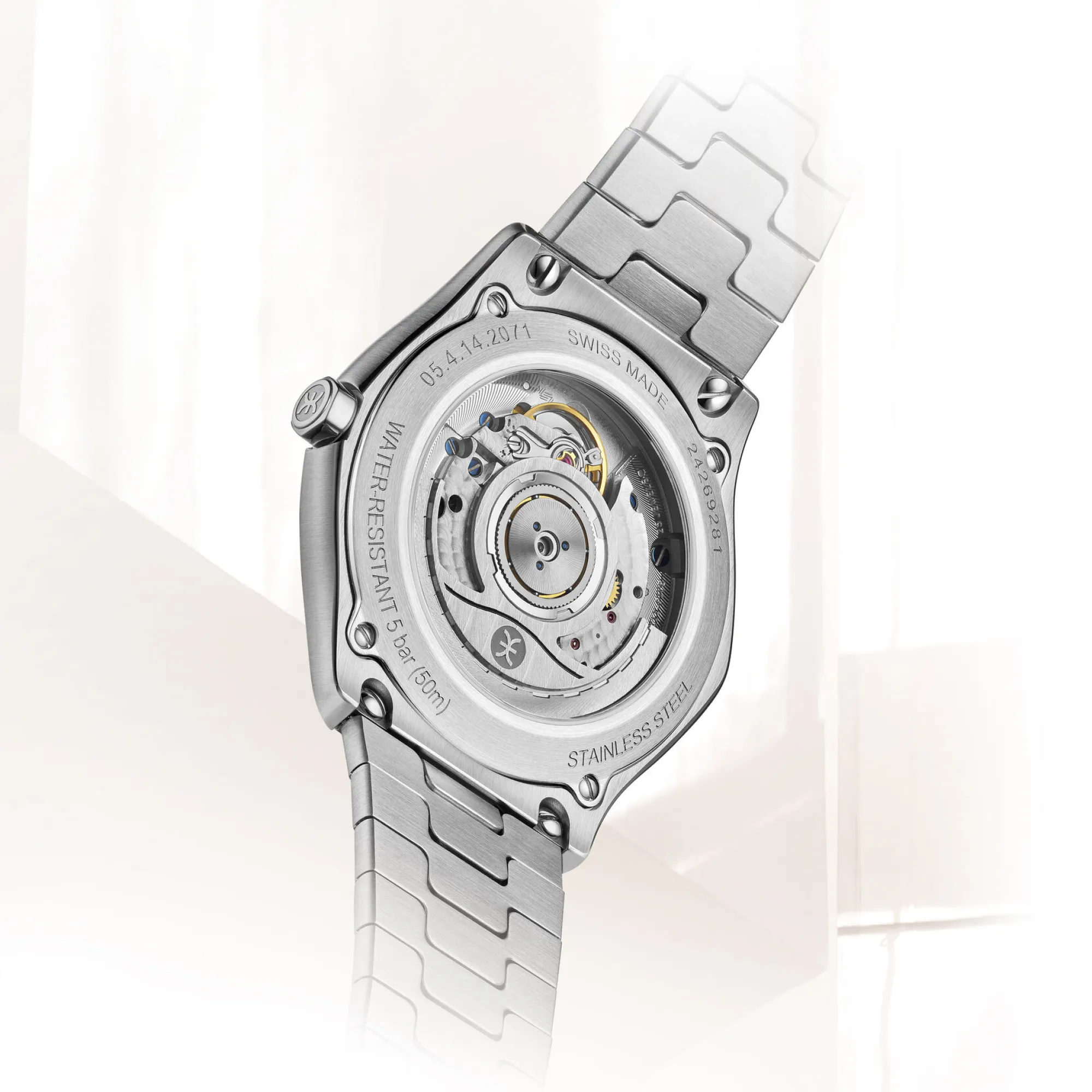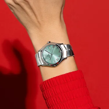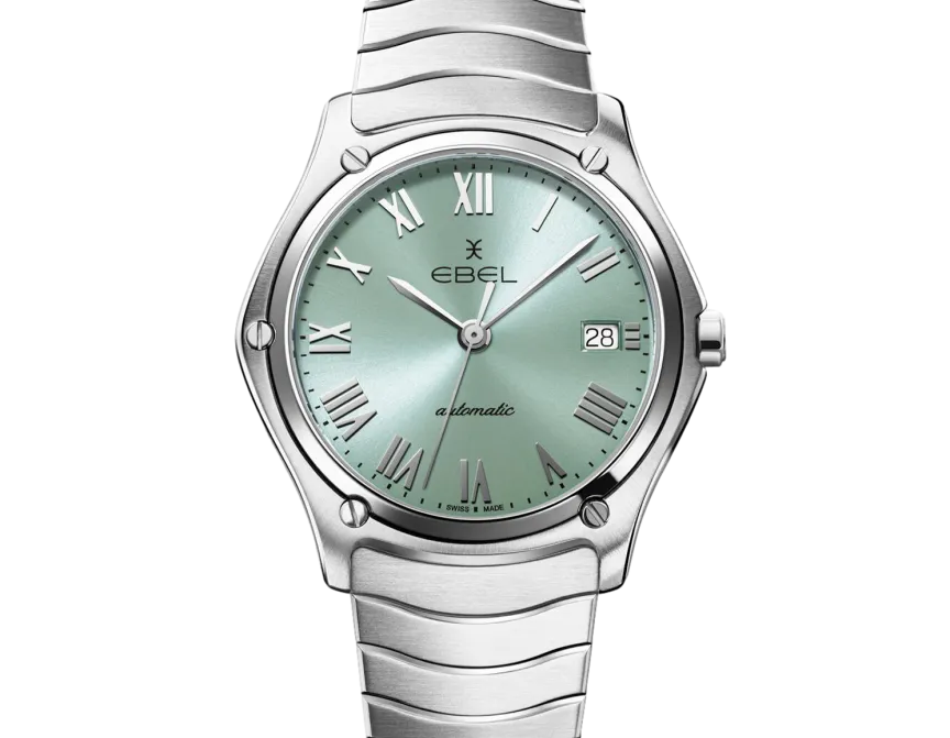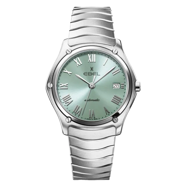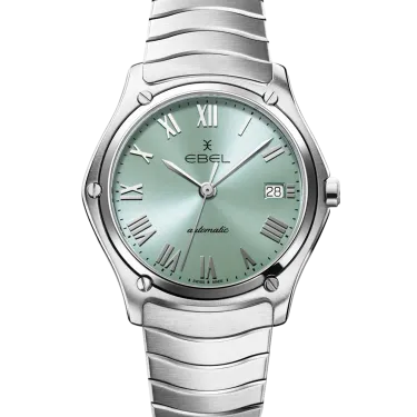 EBEL Sport Classic watch, stainless steel case, Ø 37mm, mint blue galvanic dial with rhodium-plated Roman numerals, sapphire crystal with antireflective treatment underneath, stainless steel wave link bracelet with a folding clasp, Swiss automatic movement, water-resistant up to 5 bar.
