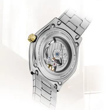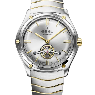 Men's EBEL Sport Classic watch, stainless steel and 18K yellow gold case, Ø 42mm, the balance is visible through the rhodium-coloured galvanic dial, sapphire crystal with antireflective treatment underneath, sapphire crystal case-back, two-tone stainless steel wave link bracelet with a folding clasp, Swiss automatic movement, water-resistant up to 5 bar.