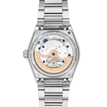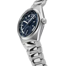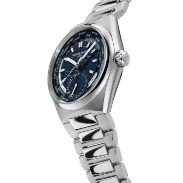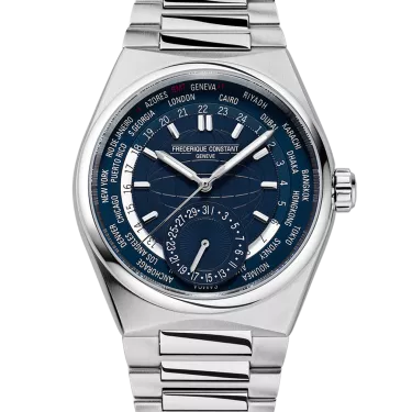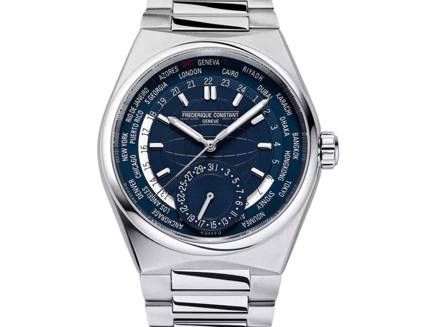 Frederique Constant Highlife Worldtimer 41 mm with functions Hours, minutes, seconds, date by hand, worldtimer; FC-718 Manufacture caliber, automatic with all functions adjustable by the crown, Perlage & circular Côtes de Genève decoration on the movement & 26 jewels, 38-hour power reserve, 28’800 alt/h; Brushed and polished stainless steel 3-part case, Diameter of 41 mm, Height of 12,90 mm, Front convex sapphire crystal, See-through case back & Water-resistant up to 5 ATM; Blue dial, globe decoration and silver color applied indexes with white luminous treatment, 24H disc with day (white) & night (blue) indication, City disc with 24 cities, Hand-polished silver color with white luminous treatment hour and minute hands, Hand-polished silver color second hand & Date counter at 6 o’clock with hand-polished silver color hand; Brushed and polished stainless steel 3-link bracelet & Including two additionnal blue straps: one rubber strap and one nubuck leather strap.