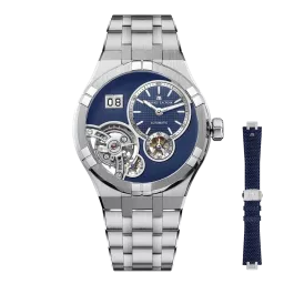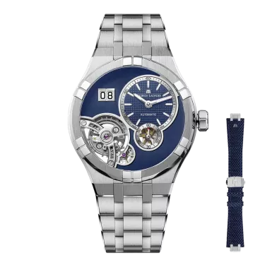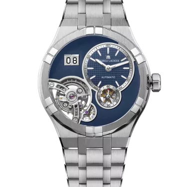 The AIKON Master Grand Date represents a breakthrough in watchmaking. The 45mm steel case perfectly fuses the spirit of mechanical watchmaking of the Masterpiece collection and the iconic AIKON style. The dynamic lines, the case/bracelet integration, the bezel’s arms and the polished, matte AIKON steel case welcome the ML331 calibre, a newcomer in Maurice Lacroix’ s collection of manufacture movements. It offers a clear view of its balance wheel, visible through a large skeleton opening, and features a large date display with double window.