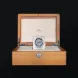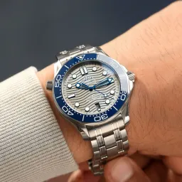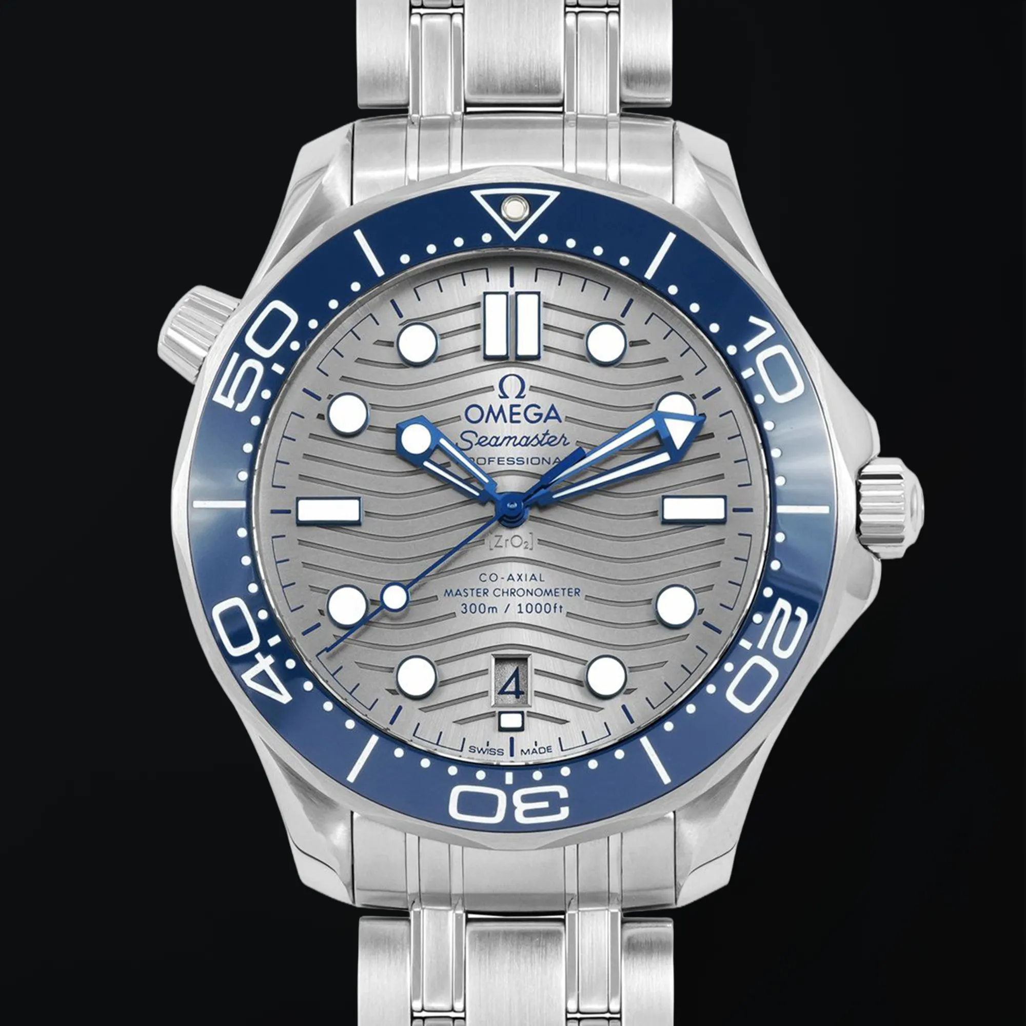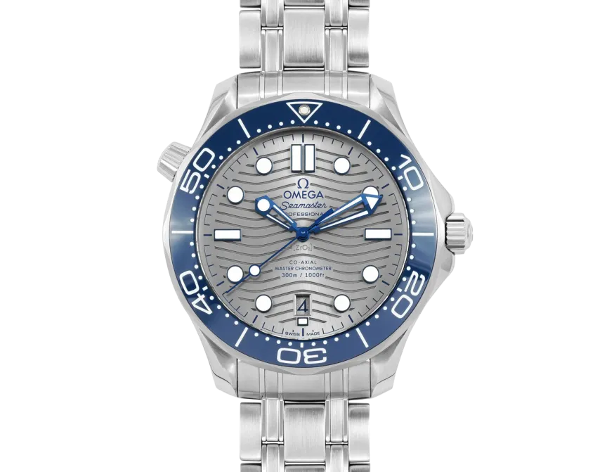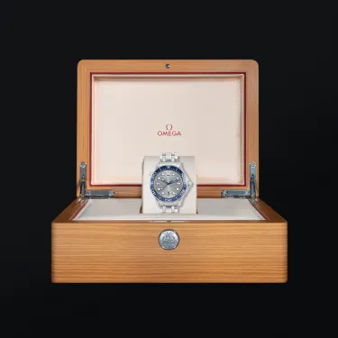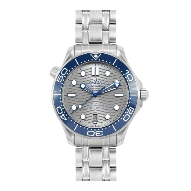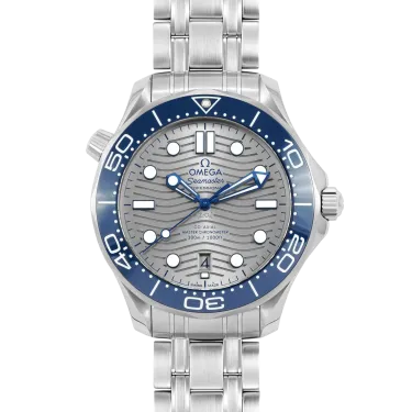 Omega Seamaster Diver 300M 42 mm is crafted from stainless steel and includes a blue ceramic bezel with a white enamel diving scale. The dial is sun-brushed PVD chrome colour ceramic and features laser-engraved waves and a date window at 6 o’clock. The skeleton hands and raised indexes are blued and are filled with white Super-LumiNova, while the helium escape valve has been given a conical design. The watch is presented on a stainless steel bracelet and is driven by the OMEGA Master Chronometer Calibre 8800, which can be seen through the sapphire-crystal on the wave-edged caseback.