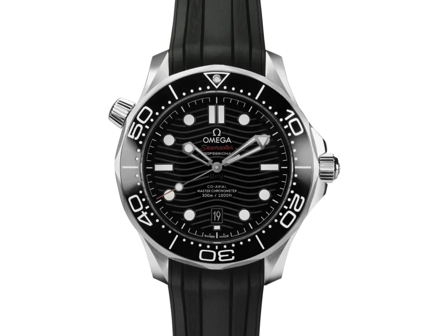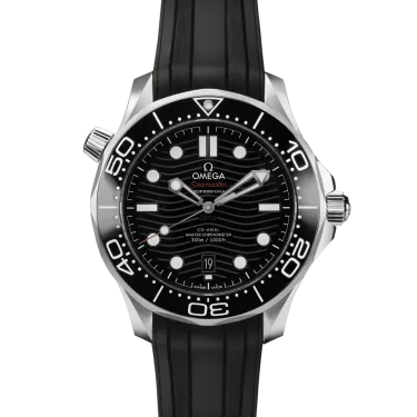 Omega Seamaster Diver 300M 42 mm is crafted from stainless steel and includes a black ceramic bezel with a white enamel diving scale. The dial is also polished black ceramic and features laser-engraved waves and a date window at 6 o’clock. The skeleton hands and raised indexes are rhodium-plated and are filled with white Super-LumiNova, while the helium escape valve has been given a conical design. The watch is presented on a black rubber strap and is driven by the OMEGA Master Chronometer Calibre 8800, which can be seen through the sapphire-crystal on the wave-edged caseback.