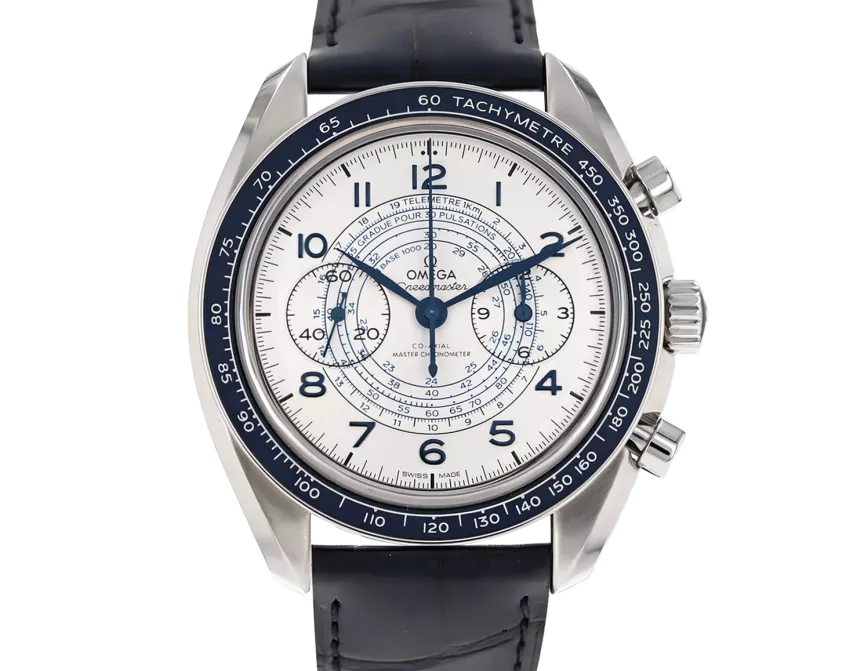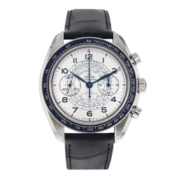 Stainless steel case with a blue (alligator) leather strap. Fixed stainless steel bezel with an inlaid blue aluminium ring showing tachymeter markings. Silver dial with blue hands and Arabic numeral hour markers. Telemeter markings and pulsometer scale around an inner ring. Minute markers. Minute markers around the outer rim. Dial Type: Analog. Chronograph - two sub-dials displaying: 60 second and 12 hour. Omega calibre 9908 hand wind movement. Scratch resistant sapphire crystal. Pull / Push crown. Transparent case back. Round case shape. Case size: 43 mm. Band width: 21 mm. Water resistant at 50 meters / 165 feet. Functions: chronograph, hour, minute, second.
