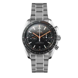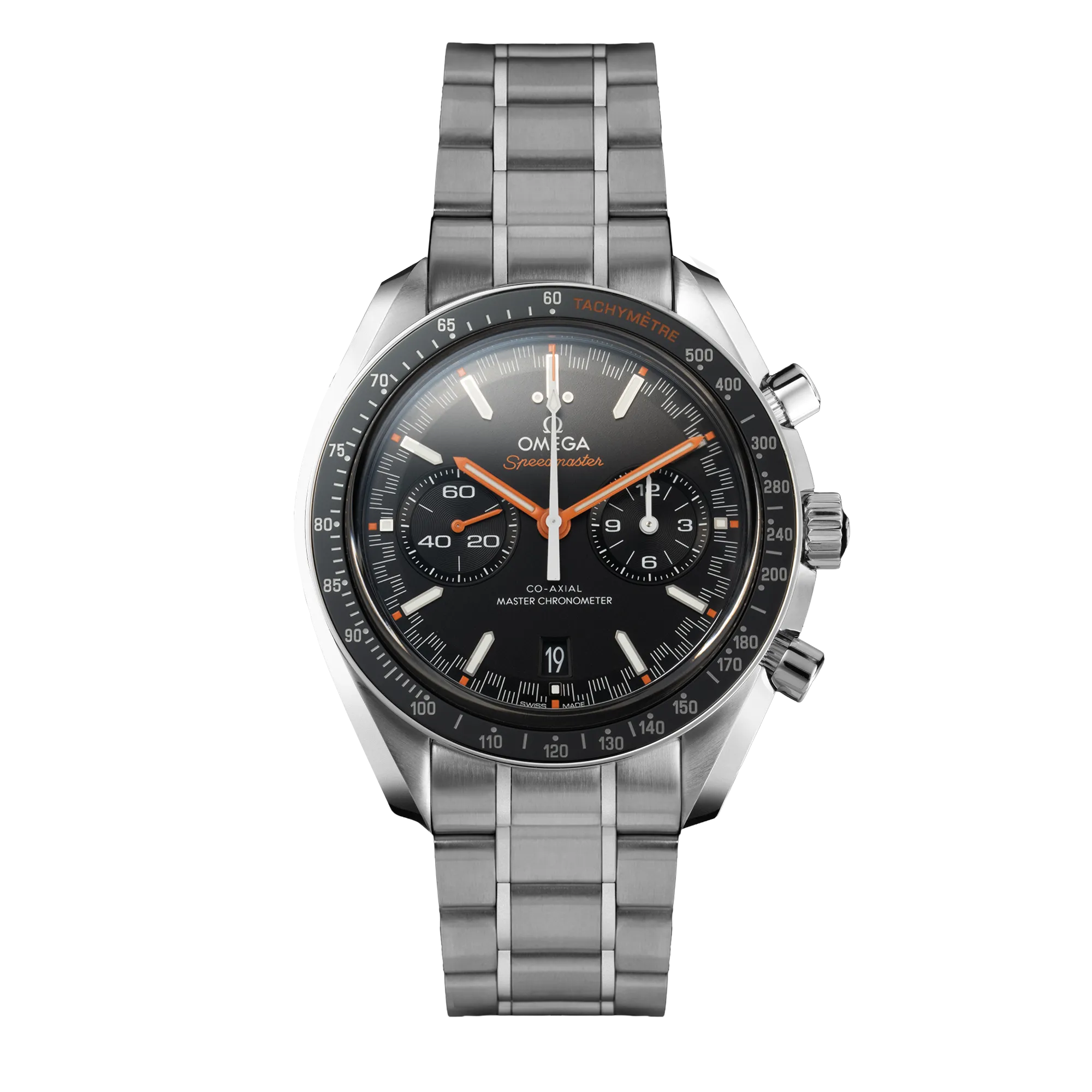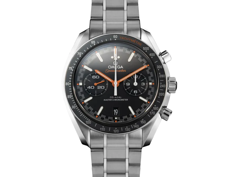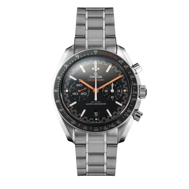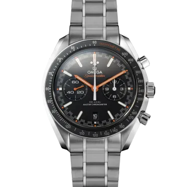 This Speedmaster Racing Master Chronometer model features a 44.25 mm stainless steel case and bracelet with a black ceramic bezel ring that includes the famous tachymeter scale in orange wording and Liquidmetal™ numbers. On the matt black dial, there is a distinctive racing style minute-track which gives the watch its name. There are also two subdials with blackened applied rings as well as a 6 o’clock date window that blends with the colour of the dial. The hands are a mix of varnished orange and white, while the arrowhead indexes are 18K white gold with white Super-LumiNova. The watch is driven by the OMEGA Co-Axial Master Chronometer 9900, certified by METAS at the industry’s highest standard.