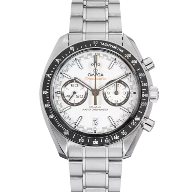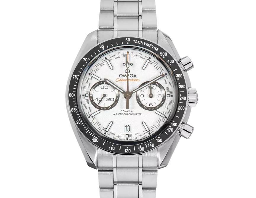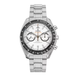 Stainless steel case, polished and satin-finished, diameter 44.25 mm, stainless steel bezel with black ceramic inlay and tachometer ladder, polished stainless steel strap with safety folding loop, white Zifferblatt with Sunray and applied, bright hand-luminous markers, automatic movement, with co-axial exhaust calibre 9900 Omega, 54 rubia, 28'800 a/h, power reserve 60 hours, date display, and scratch-resistant, double-sided Master Chronometer, sapphir glass, stainless steel, screw back to bottom, ereficant, entilingerated with bottom, stainting, stantantanted, sinting, stantantainting, sing, stantantanting, sintantar 5