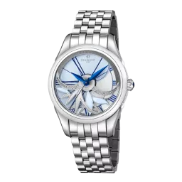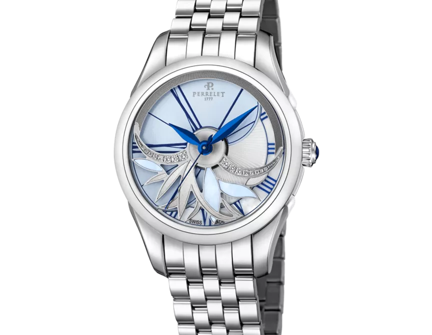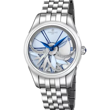 Perrelet enriches its ladies’ Diamond Flower line with a new model named Diamond Flower Amytis : collection designed “by women for women” and which combines a unique technique with brilliant expertise. This name evoking ancient history is inspired by the story of the hanging gardens of Babylon. The precious timepieces are equipped with the Double Rotor P-181-H caliber, patented by Perrelet and entirely produced within its Manufacture. In this collection, the rotor on the dial side depicts flower petals swaying in step with wrist movements. Each woman becomes actively involved in the poetic dynamics of her watch through her physical gestures. The mother-of-pearl, diamond, black, white or anthracite dials offer a delightful array of colors and contrasts that will elegantly accompany every woman in her daily life. Roman numerals converging towards the center add a final touch of character and originality to this collection. Functions central hands indicating hours, minutes and seconds; 5 ATM; White and blue MOP - petal-shaped diamonds double rotor, 16 diamonds (0,067ct), Top Wesselton VS1 dial and Deployment buckle. In-house automatic movement Calibre P-181-H, 42hours power reserve.