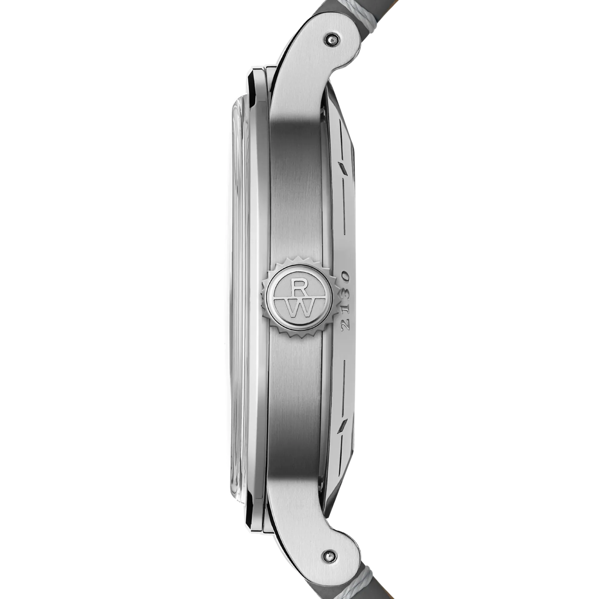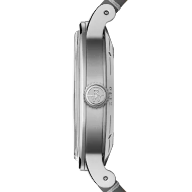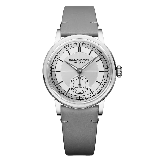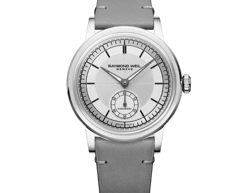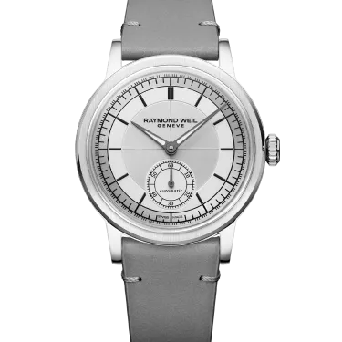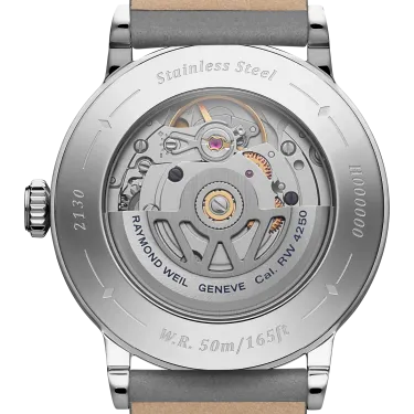 The bezel is decorated with a vertical satin-brush that contrasts wonderfully with the highly polished bevel nearby. This juxtaposition of two finishes reinforces the overall level of finishing. A sapphire caseback affords sight of the self-winding movement within and the “W-shaped” oscillating weight, RAYMOND WEIL’s horological signature. The grey genuine calf leather strap is enhanced with a unique W-stitched detail.
