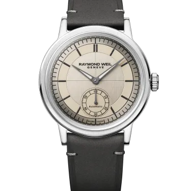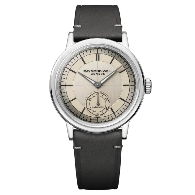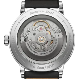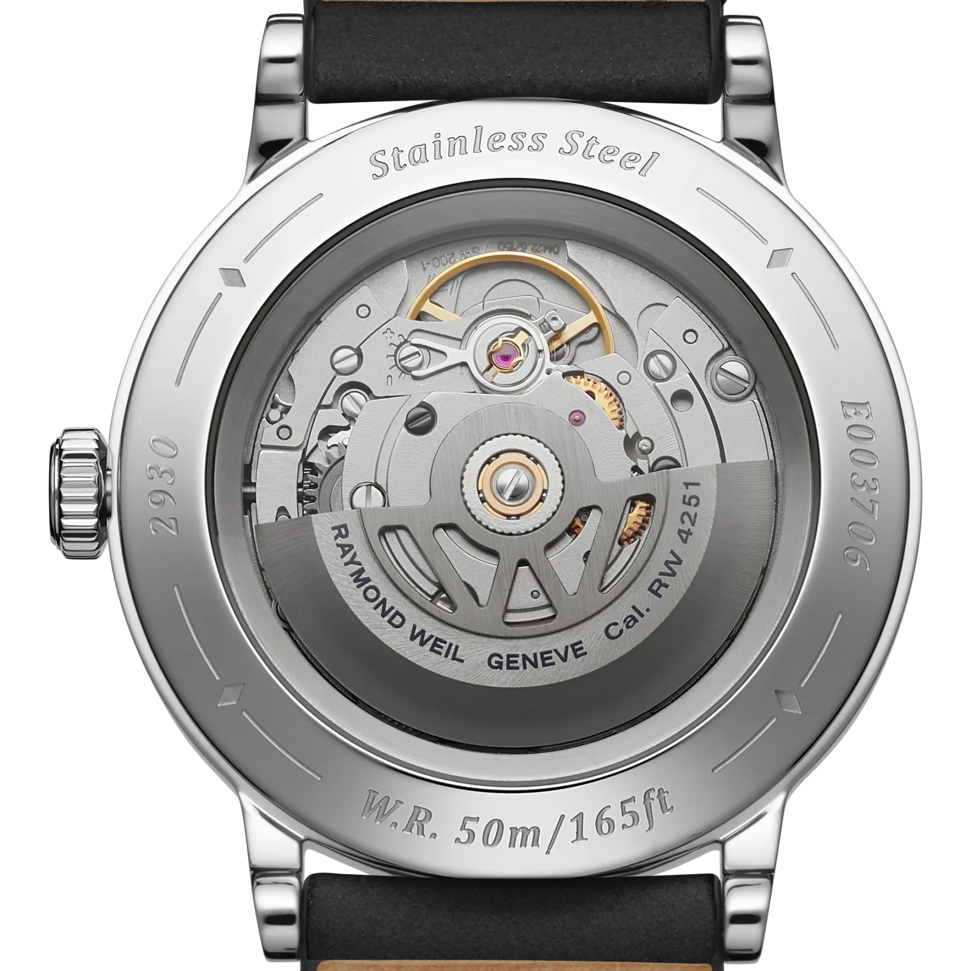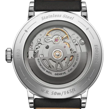 A sapphire caseback affords sight of the self-winding movement within and the “W-shaped” oscillating weight, RAYMOND WEIL’s horological signature. Offered in a selection of dial colours, each model is paired with a colour-coordinating genuine calf leather strap with a unique W-stitched detail.