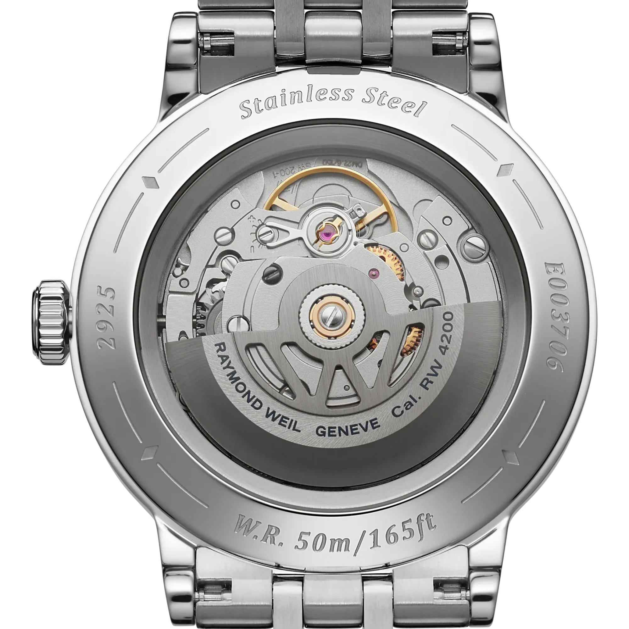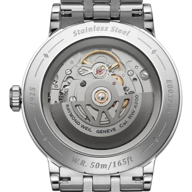 A sapphire caseback affords sight of the self-winding movement within and the “W-shaped” oscillating weight, RAYMOND WEIL’s horological signature.