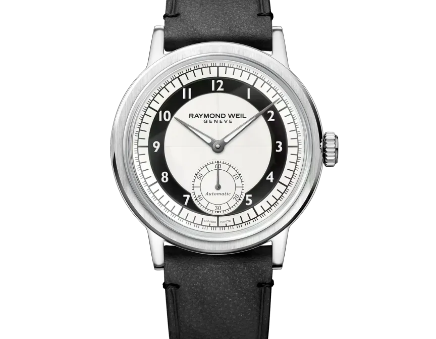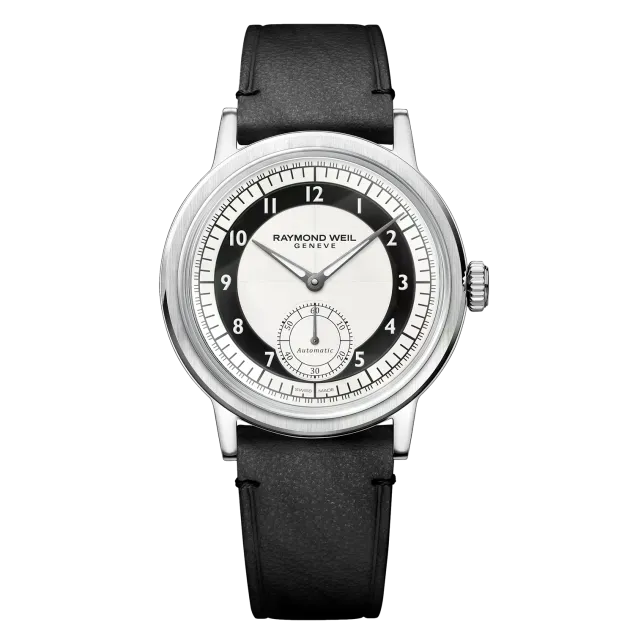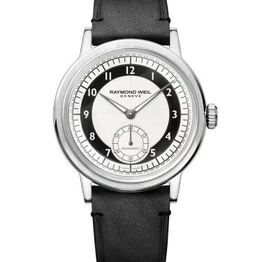 With the millesime small seconds, RAYMOND WEIL revisits the Tuxedo dial, a design style experiencing a notable revival, defined by bold, two-tone contrasts and formal elegance.