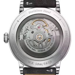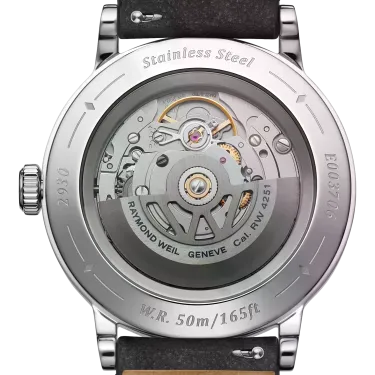 This timepiece is housed in a slender 39 mm stainless steel case with elegant, balanced proportions. The bezel features a vertical satin-brushed finish set against a delicately polished chamfer, highlighting the Maison’s attention to detail through the interplay of textures. A transparent case back reveals the automatic movement and the W-shaped oscillating weight, a signature element of RAYMOND WEIL watchmaking, delivering a 41-hour power reserve. The genuine calfskin strap is finished with a discreet W-shaped stitch, reinforcing the brand’s identity.