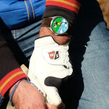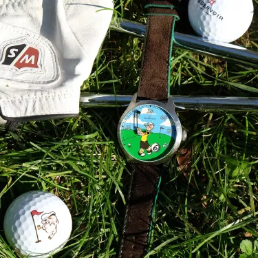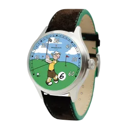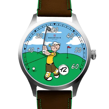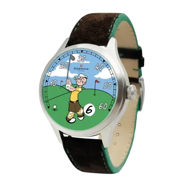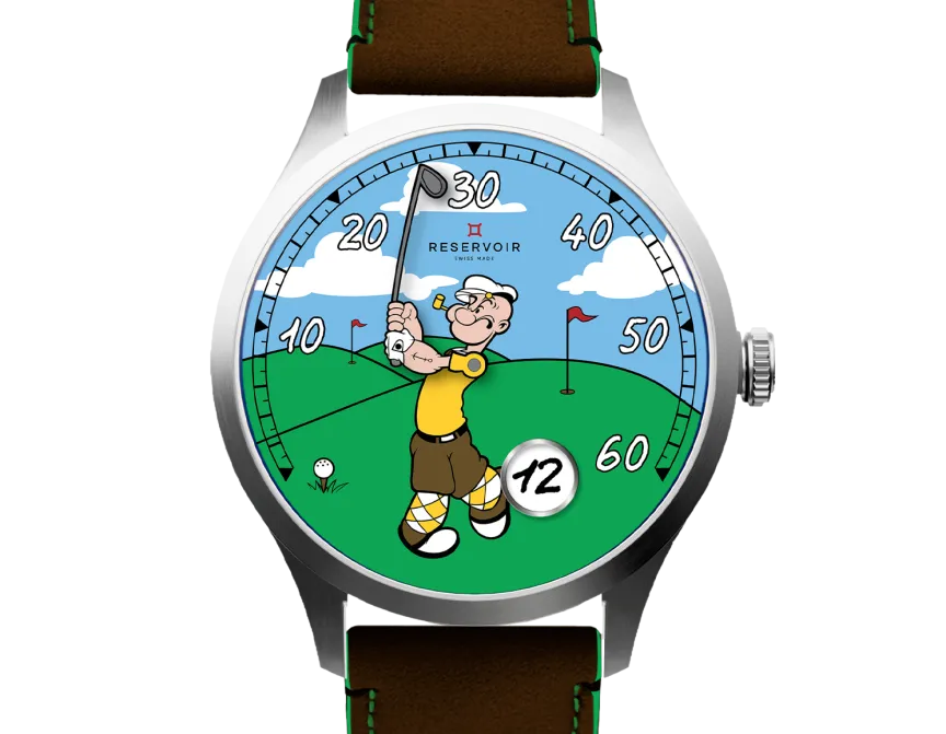 The new RESERVOIR x Popeye Golf watch features a single-hand dial inspired by Popeye, showcasing a golfer mid-swing against a golf course backdrop. This playful design offers a mix of humor and horological precision, featuring a retrograde minute display and a jumping hour complication at the 5 o’clock position. The 41.5mm stainless steel case is paired with a brown nubuck leather strap with green stitching, emphasizing both style and functionality.