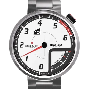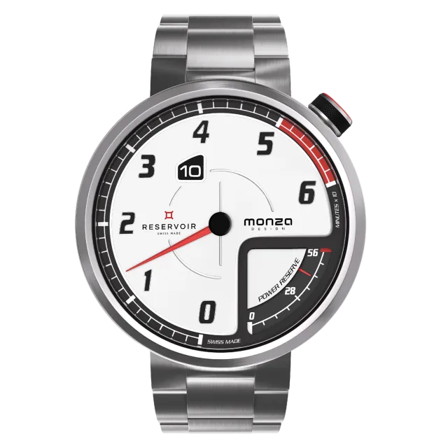 The collaboration RESERVOIR by MONZA Design seamlessly blends the spirit of the racetrack with the intricacies of watchmaking. Drawing inspiration from the adrenaline-fueled world of the sport racing car with a prancing horse, this wristwatch is a tribute to speed and precision. Its starts with a breathtaking screw-crown at 2 with rubber grip where “Engine Start” is engraved. The White Dial of the MONZA Design 315W sets a vibrant stage that evokes the focus of a driver in the midst of competition, an homage to this iconic car’s RPM counter. Meticulously crafted to convey the motion and velocity in a 43 mm case with brushed finishing mounted on a stainless steel bracelet, the Red Hand retrograde minute is akin to the swift movements of a finely-tuned engine, moving from 0 to 6, times 10 minutes, along embossed index numbers with metal outline, toward a Red Zone offering a visual parallel to the automotive experience.