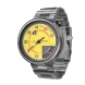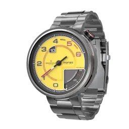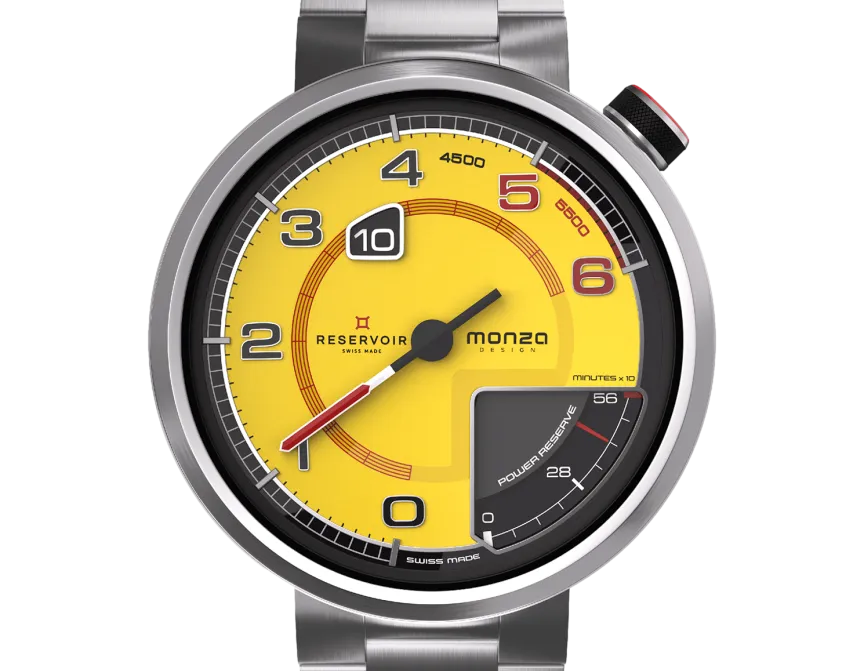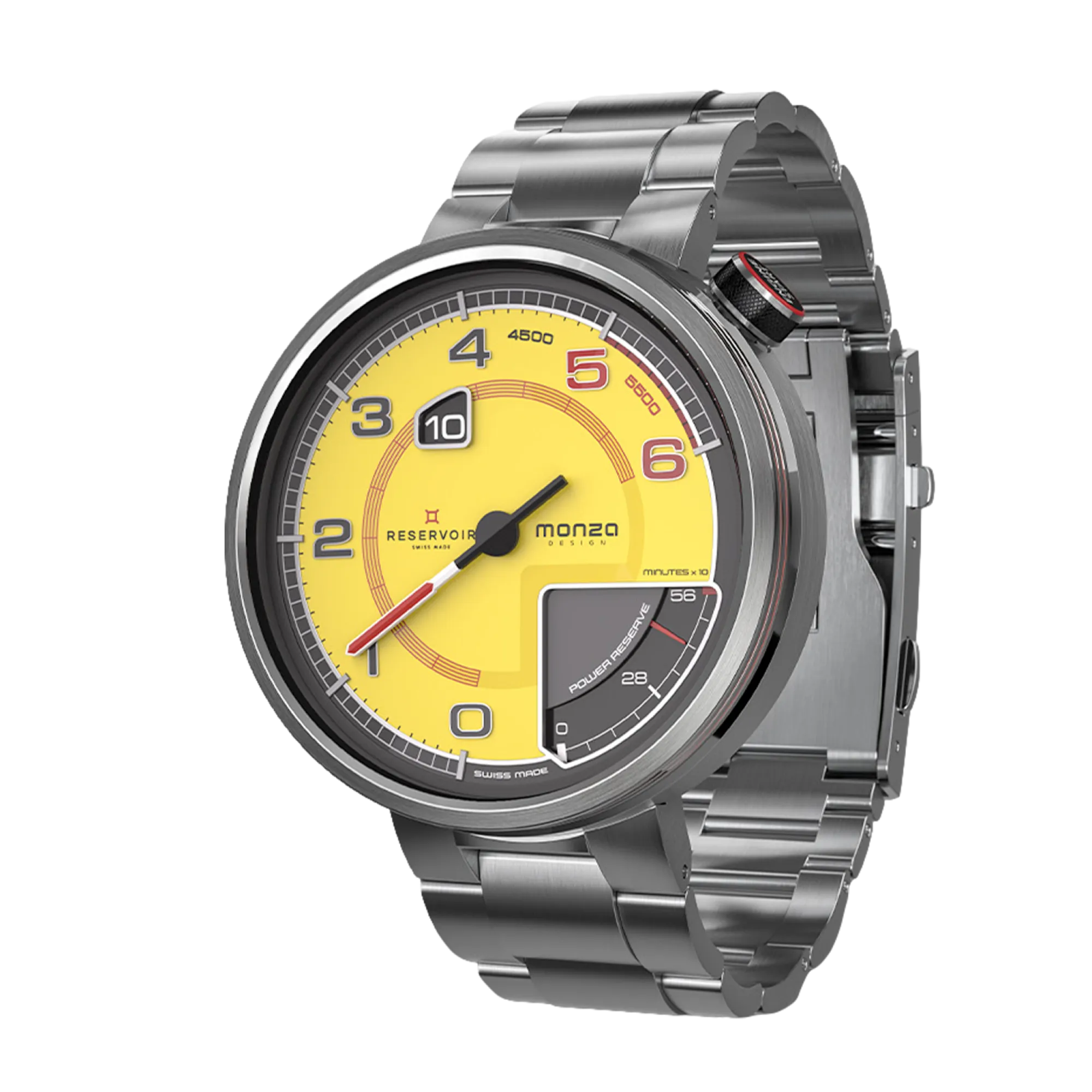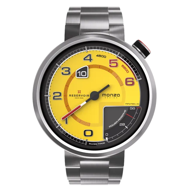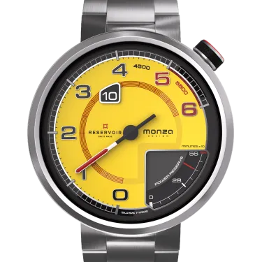 The collaboration RESERVOIR by MONZA Design seamlessly blends the spirit of the racetrack with the intricacies of watchmaking. Drawing inspiration from the adrenaline-fueled world of the sport racing car with a prancing horse, this wristwatch is a tribute to speed and precision. Its starts with a breathtaking screw-crown at 2 with rubber grip where “Engine Start” is engraved. The Yellow Dial of the MONZA Design 325Y sets a vibrant stage that evokes the focus of a driver in the midst of competition, an homage to this iconic car’s RPM counter. Meticulously crafted to convey the motion and velocity in a 43 mm case with brushed finishing mounted on a stainless steel bracelet, the White and Red Hand retrograde minute is akin to the swift movements of a finely-tuned engine, moving from 0 to 6, times 10 minutes, along embossed index numbers with metal outline, toward a Red Zone offering a visual parallel to the automotive experience.