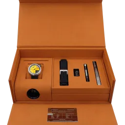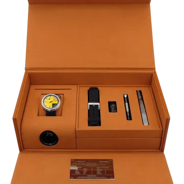 Delivered in a Luxury racing car garage toolbox-inspired watch box, with three watchmaking tools : a magnifier for examining the intricate mechanics, an anti-magnetic watchmaker screwdriver, and precise watchmaker pliers. The box holds a tray designed to store MONZA Design eyeglasses and its favorite racing car keys. Additional black rubber strap featuring a racing car tire imprint included, along with four screws for an easy change.