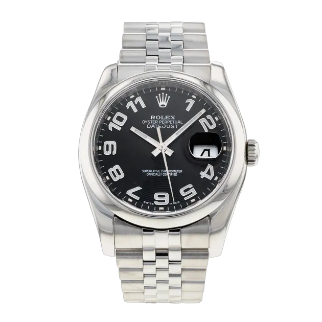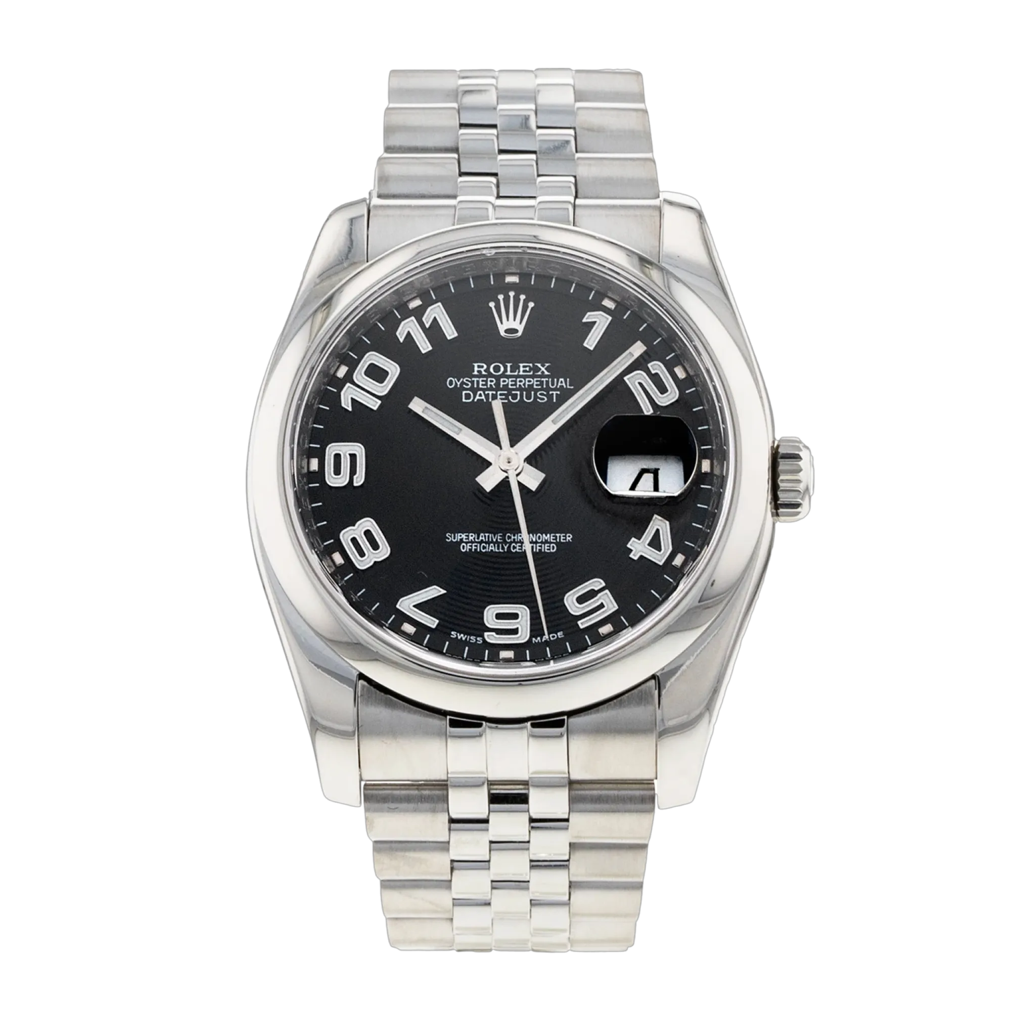 Rolex Datejust 116200 Movement : Automatic Case size : 36mm Case material : Steel Bracelet material : Steel (Jubilee) Dial type : Black Concentric Arabic Water resistance : 100 Metres