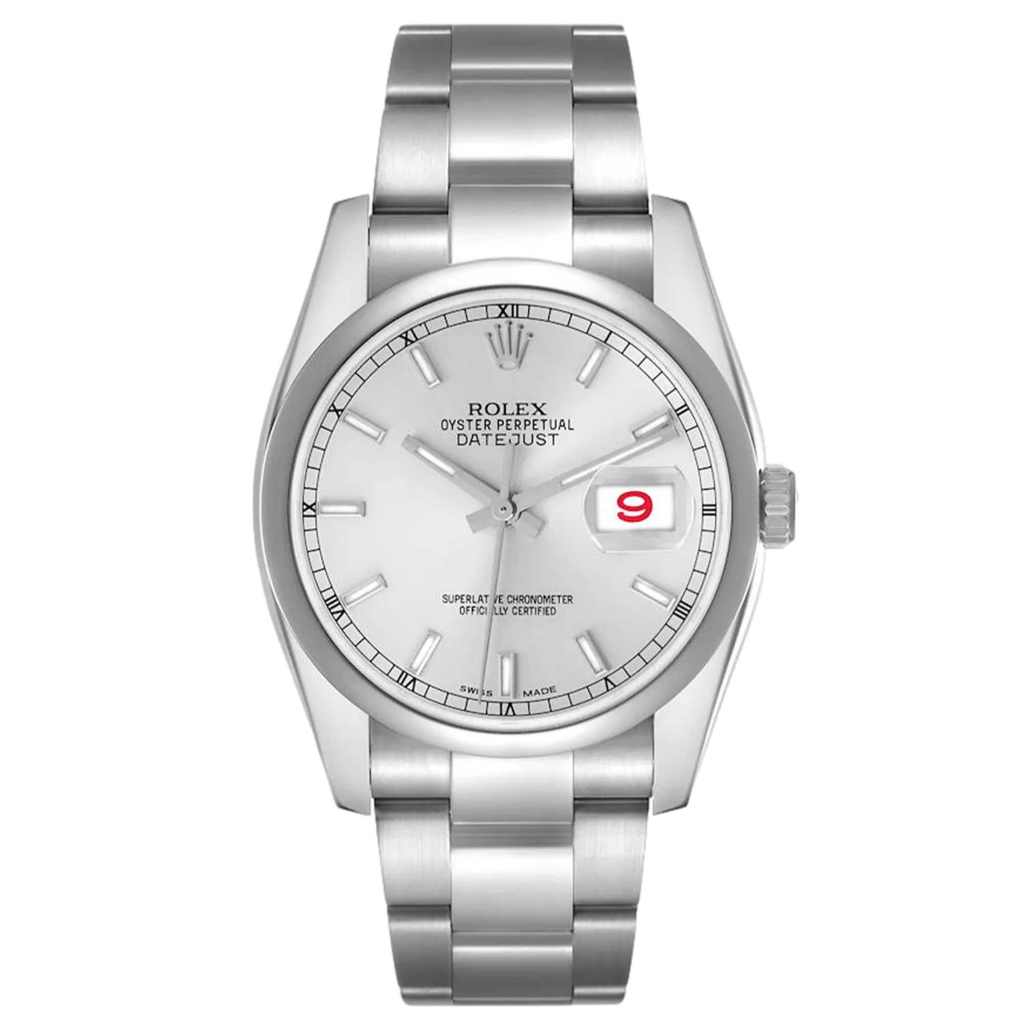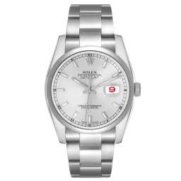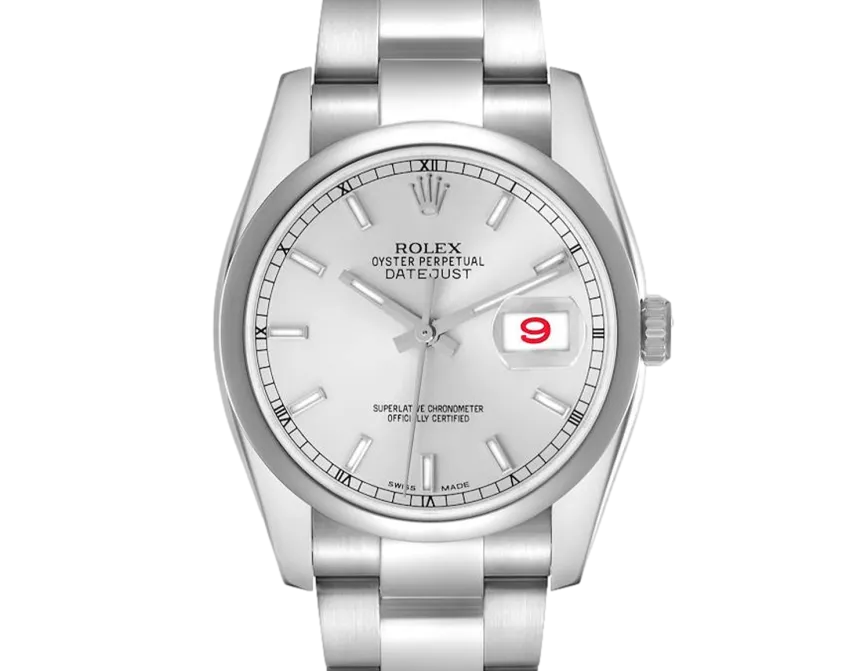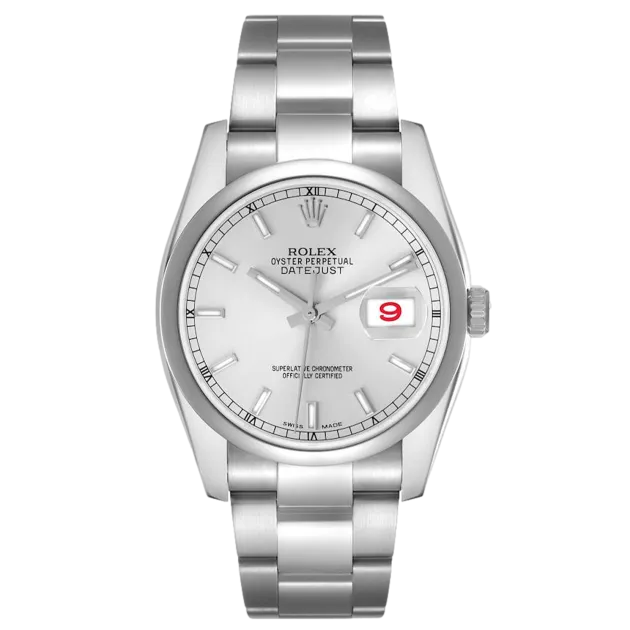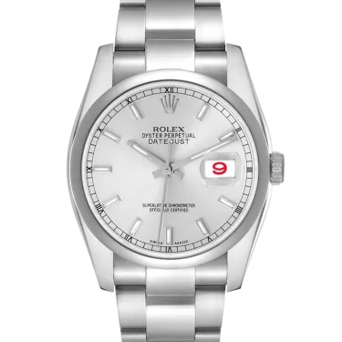 Rolex Datejust 116200 Movement : Automatic Case size : 36mm Case material : Steel Bracelet material : Steel (Oyster) Dial type : Silver Baton Water resistance : 100 Metres
