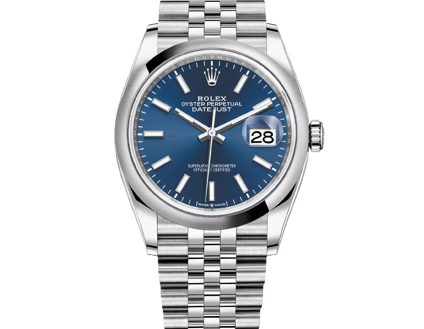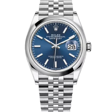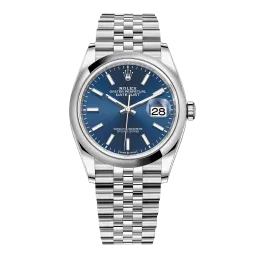 Rolex Datejust 126200 Movement : Automatic Case size : 36mm Case material : Steel Bracelet material : Steel (Jubilee) Dial type : Blue Baton Water resistance : 100 Metres