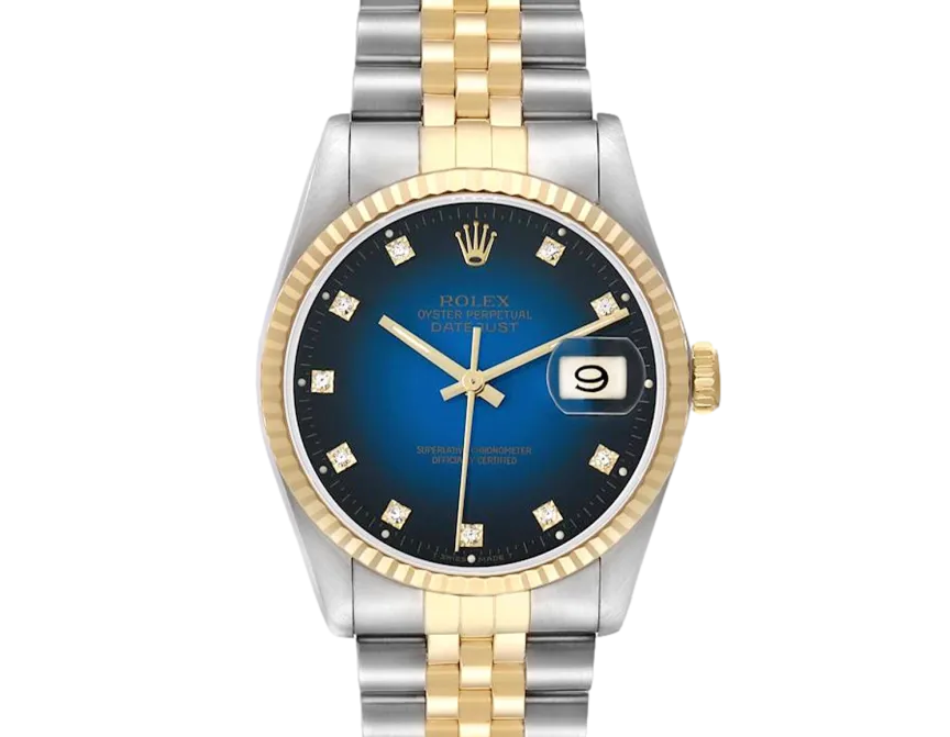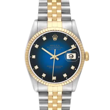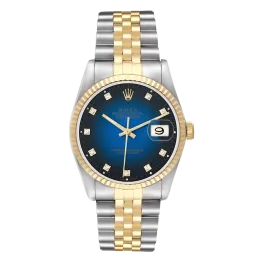 Rolex Datejust 16233 36 mm, Stainless steel/Gold case and Jubilee strap, Yellow Gold bezel, Fold clasp, Blue dial, Automatic movement, Movement/Caliber 3135, 10 ATM water resistance with original box, original papers and is in perfect working conditions. This watch has been checked, certified and carried out the water resistance test and has 2-year warranty from the date of purchase.
