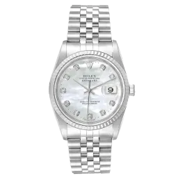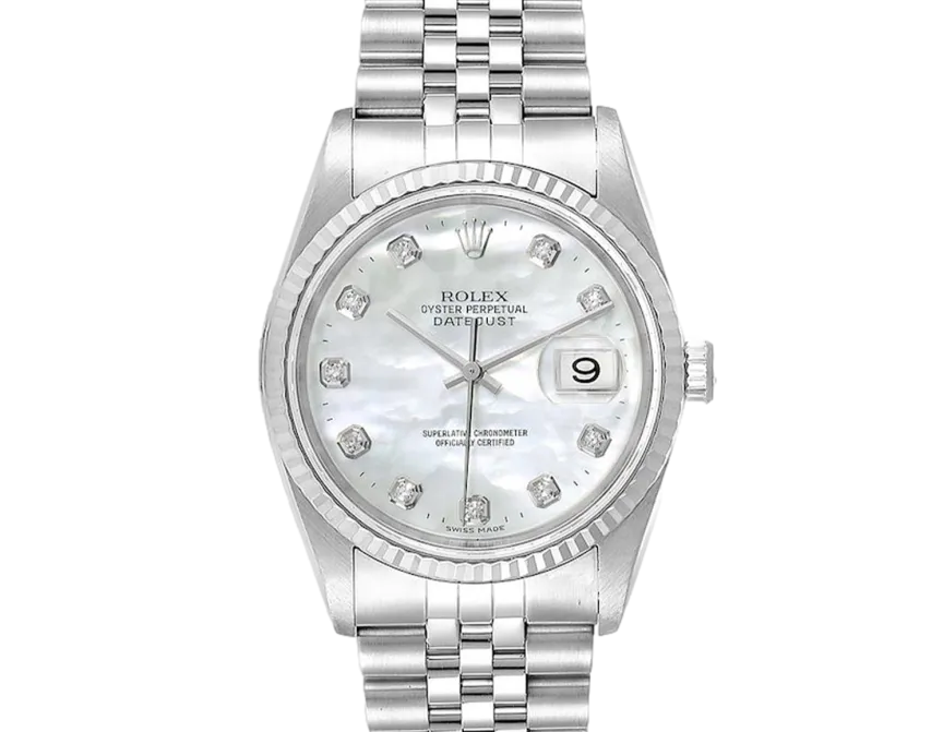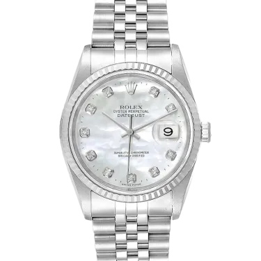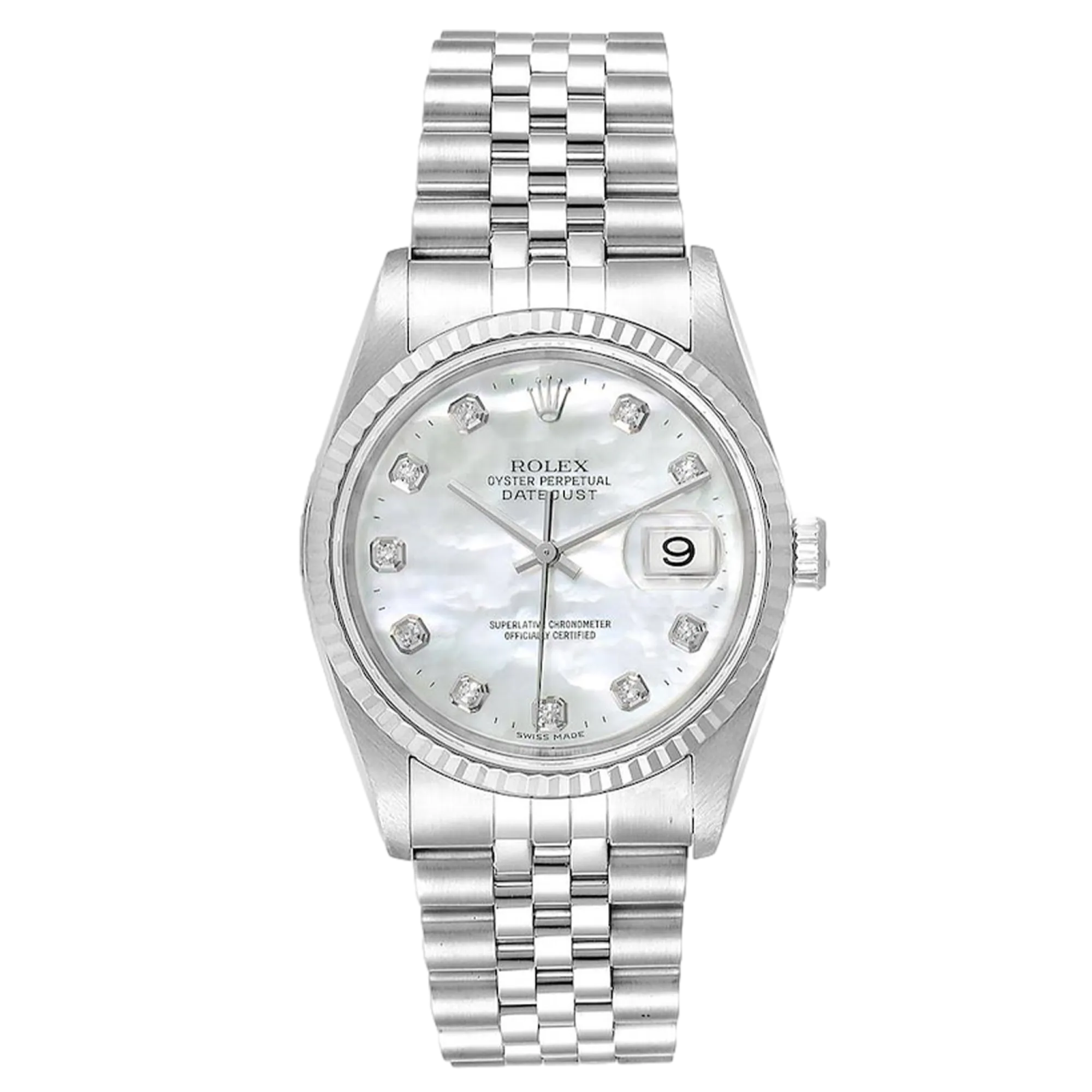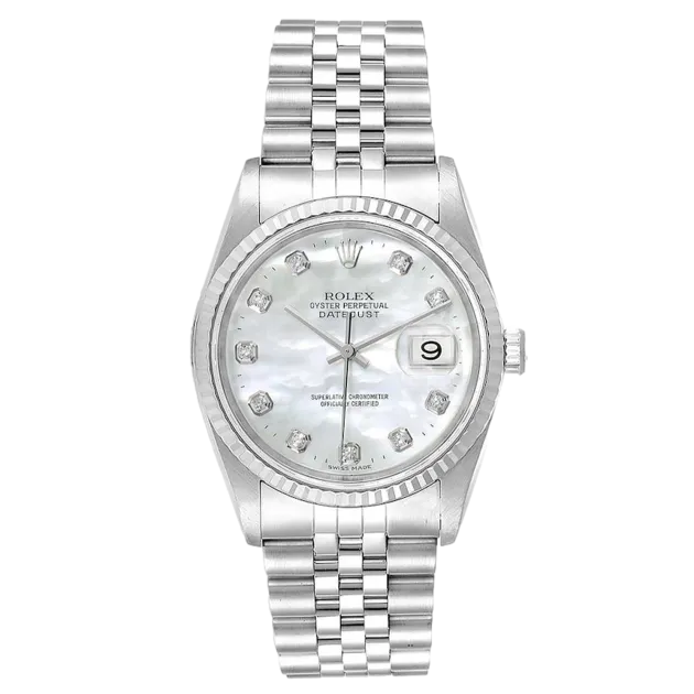 Rolex Datejust 16234 36 mm, Stainless steel case and Jubilee strap, White gold bezel, Fold clasp, Mother of pearl dial, Automatic movement, Movement/Caliber 3135, 10 ATM water resistance with original box, original papers and is in perfect working conditions. This watch has been checked, certified and carried out the water resistance test and has 2-year warranty from the date of purchase.