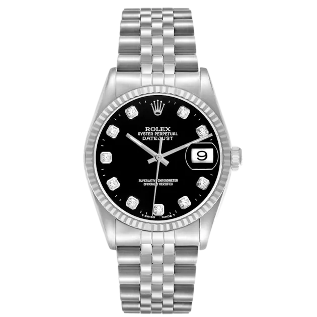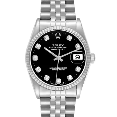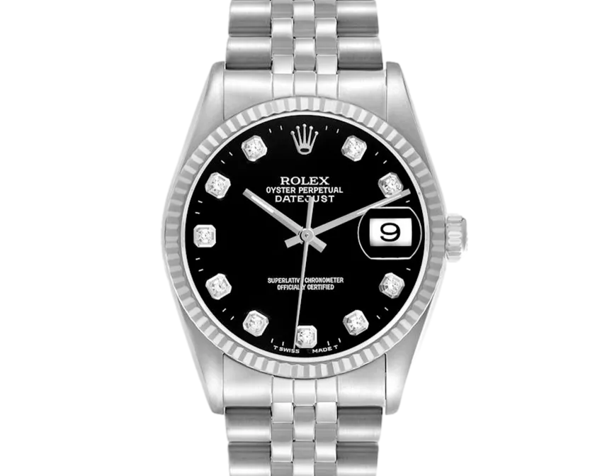 Rolex Datejust 16234 Movement : Automatic Case size : 36mm Case material : Steel & White Gold Bracelet material : Steel (Jubilee) Dial type : Black Diamond Water resistance : 100 Metres