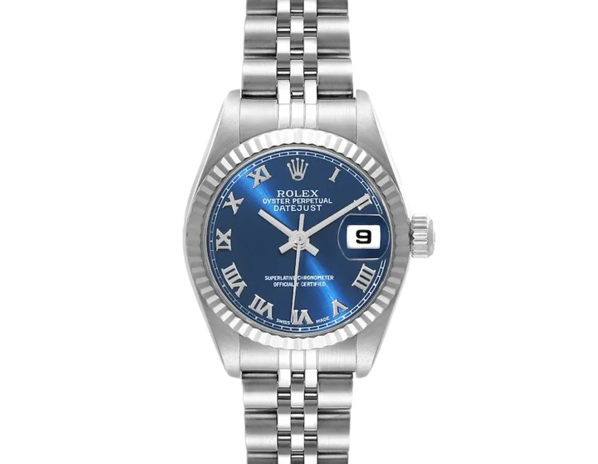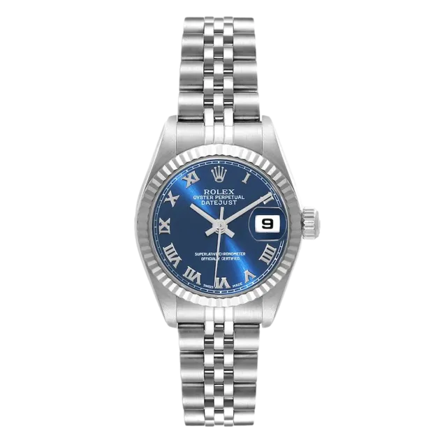 Rolex Datejust 79174 26 mm, Stainless steel case and Jubilee strap, White gold bezel, Fold clasp, Blue dial, Automatic movement, Movement/Caliber 2235, 10 ATM water resistance with original box, original papers and is in perfect working conditions. This watch has been checked, certified and carried out the water resistance test and has 2-year warranty from the date of purchase.