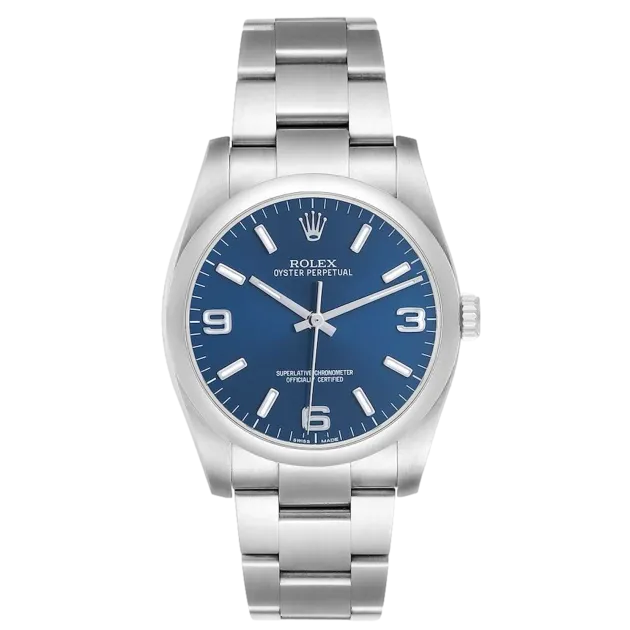 Rolex Oyster Perpetual 116000 36 mm, Stainless steel case, bezel and oyster strap, Fold clasp, Blue dial, Automatic movement, Movement/Caliber 3130, 10 ATM water resistance with original box, original papers and is in perfect working conditions. This watch has been checked, certified and carried out the water resistance test and has 2-year warranty from the date of purchase.