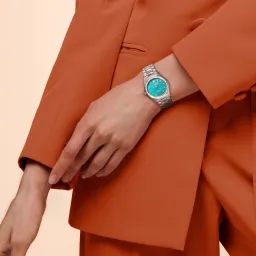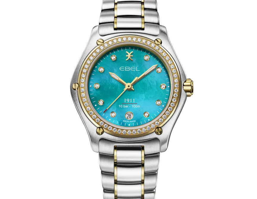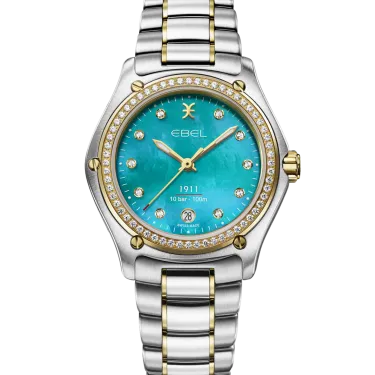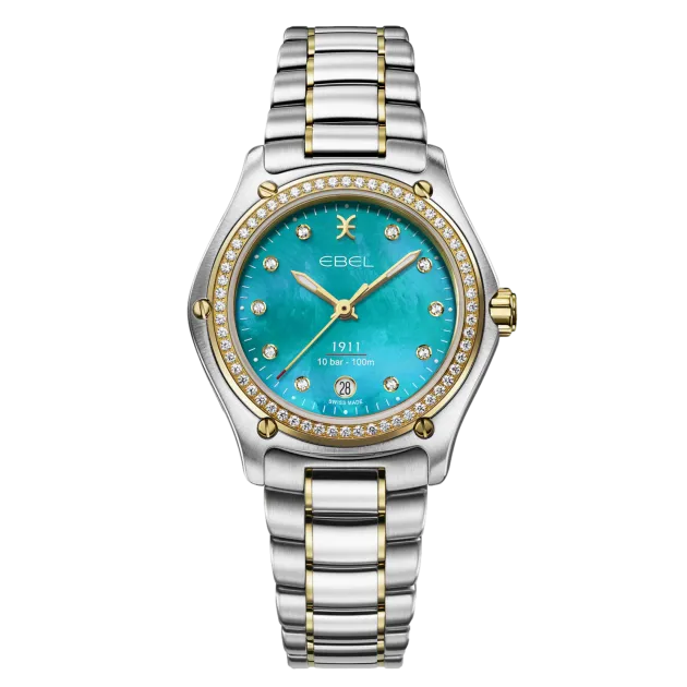 Women's watch EBEL 1911, stainless steel and 18K yellow gold case with 60 diamonds (0.292ct), Ø 30mm, deep turquoise mother-of-pearl dial with 10 diamonds (0.052ct), date window at 6:00, sapphire crystal with antireflective treatment underneath, two-tone stainless steel links bracelet, folding clasp, Swiss quartz movement, water-resistant up to 10 bar.