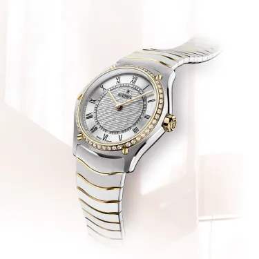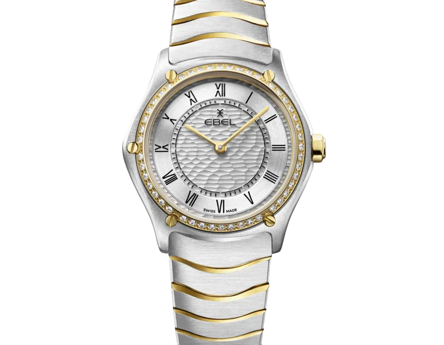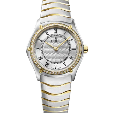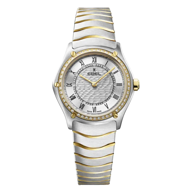 Women's EBEL Sport Classic watch, stainless steel and 18K yellow gold case with 47 diamonds (0.3055ct), Ø 29mm, white silver dial with Roman numerals engraved and painted in black, wave-textured pattern, sapphire crystal with antireflective treatment underneath, two-tone stainless steel wave link bracelet with a folding clasp, Swiss quartz movement, water-resistant up to 5 bar.