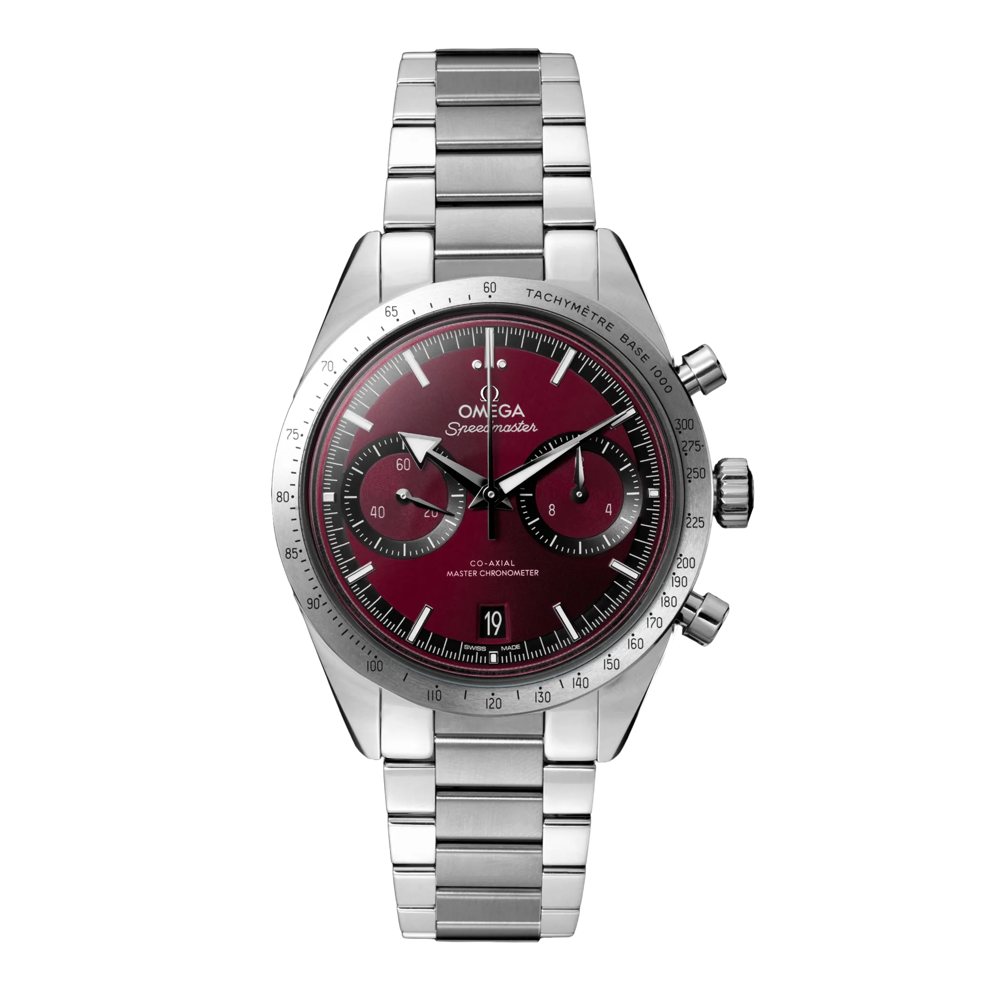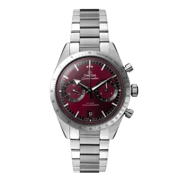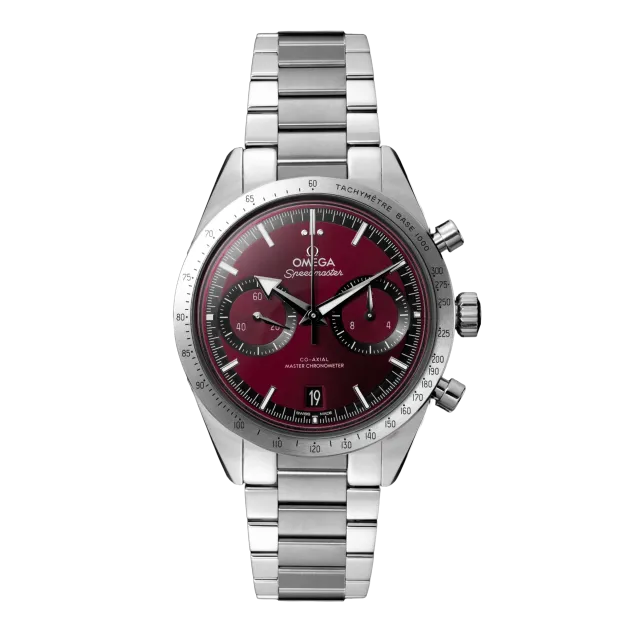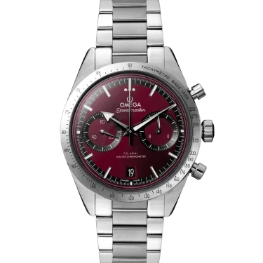 Omega Speedmaster '57 Co-Axial Master Chronometer Chronograph 40.5 mm Red Dial, Stainless Steel case, Stainless Steel strap, deployment with Foldover clasp. Silver tone hands and Index hour markers with minute markers around the outer rim and 2 sub-dials on a Red dial. Manual Wind movement. Calendar: Date at 6 o'clock. Chronograph sub-dials display: 60 Second, 12 Hours. Powered by Omega Calibre 9906 engine with 60 hours power reserve. Watch functions: Date, Power Reserve, Hour, Minute, Second, Chronograph. Scratch Resistant Sapphire crystal. 50 Meters - 165 Feet water resistant.