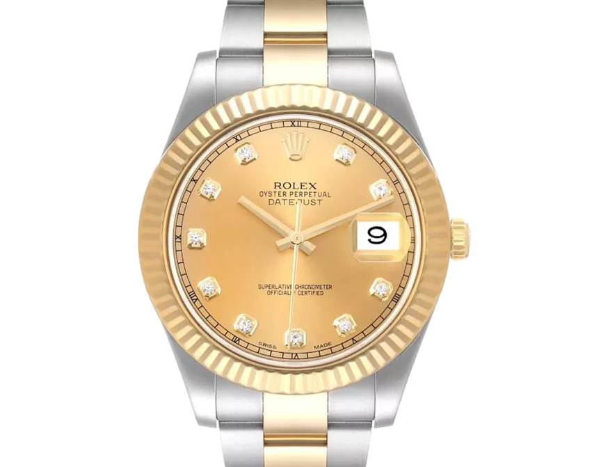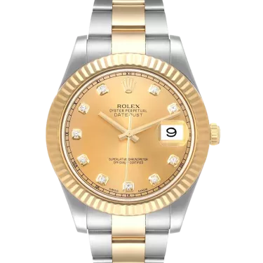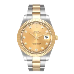 This Oyster Perpetual Datejust 41 in Oystersteel and yellow gold features a diamond champagne dial and an Oyster bracelet. The light reflections on the case sides and lugs highlight the elegant profile of the 41 mm Oyster case, which is fitted with a fluted bezel. Aesthetically, the Datejust has spanned eras, while retaining the enduring codes that make it, notably in its traditional versions, one of the most recognized and recognizable of watches. Water resistance up to 100M.